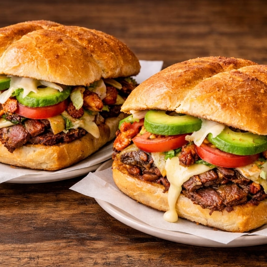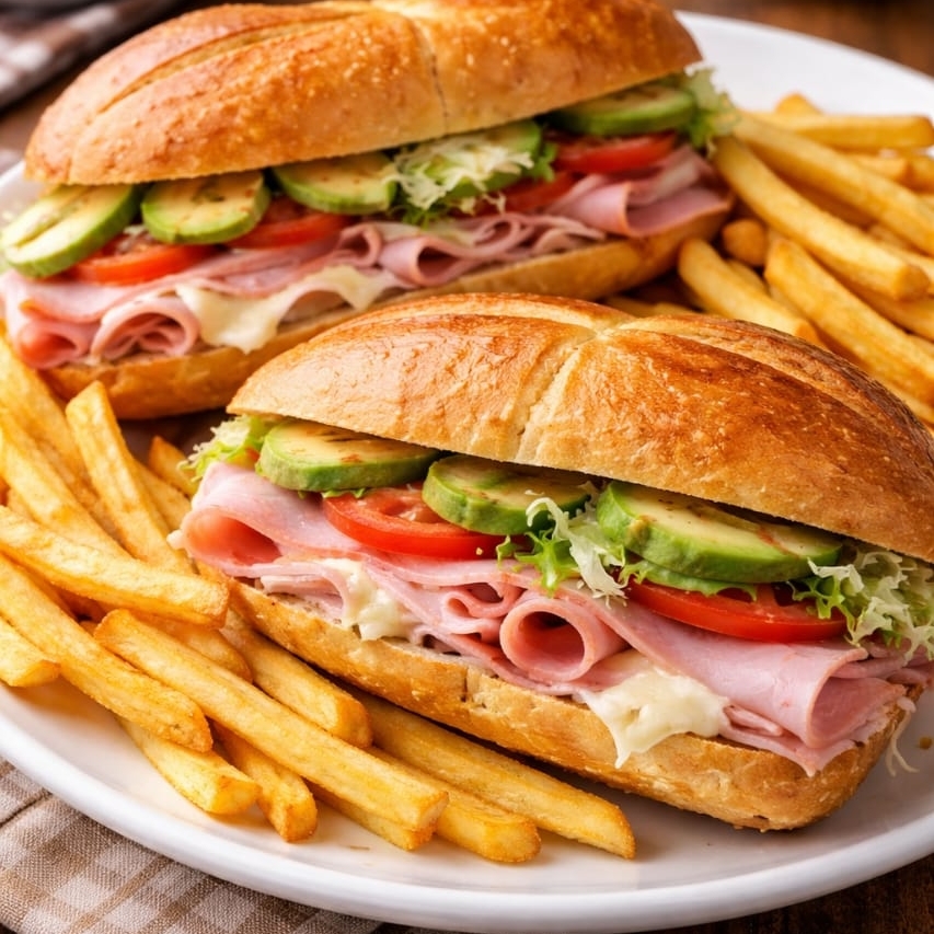 Torta CLASSICA jamón y queso y papas ala francesa americano, cebla, tomate, aguacate chile, lechuga,