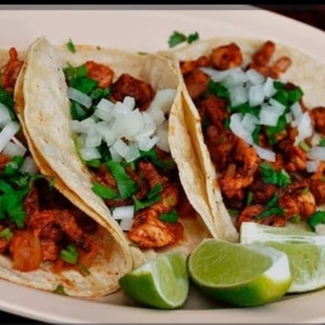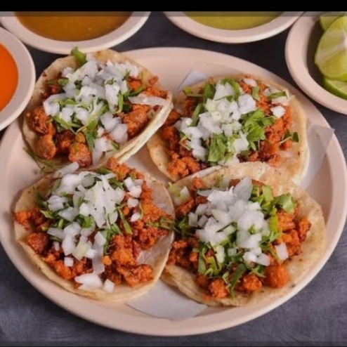 2 tacos de adobada + 1 de harina + agua / cebolla, repollo límon, salsa roja, verde