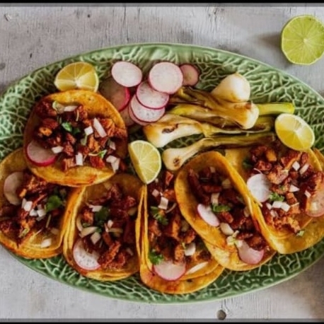 6 tacos de adobada + 1 de harina + agua, /cebolla, repollo, limón salsa verde, roja