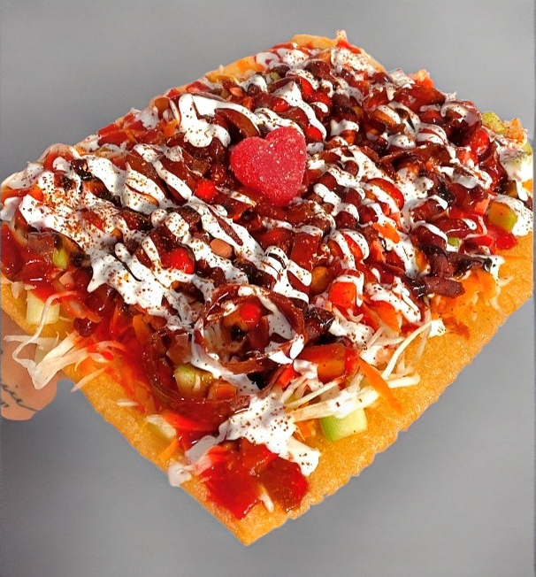 Capa de verdura ( Repollo, Pepino, zanahoria) Salchicha, cuerito, cacahuate, riel, serpentina, mix de gomitas, salsas y media crema.