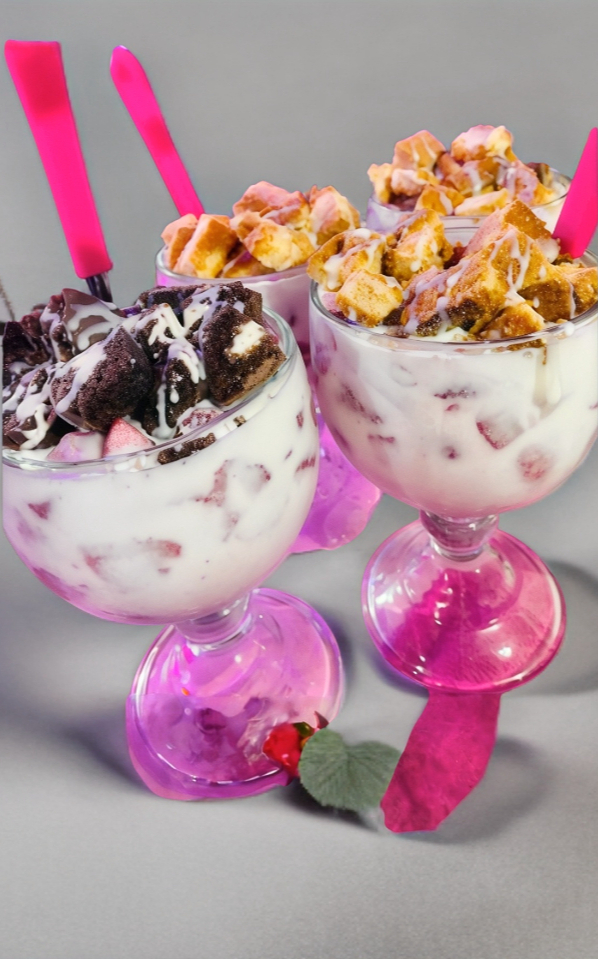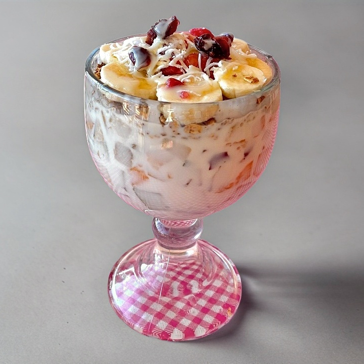 Mezcla de platano y fresa con una deliciosa crema dulce, granola, coco rallado, arandanos deshidratados, lecherita y miel