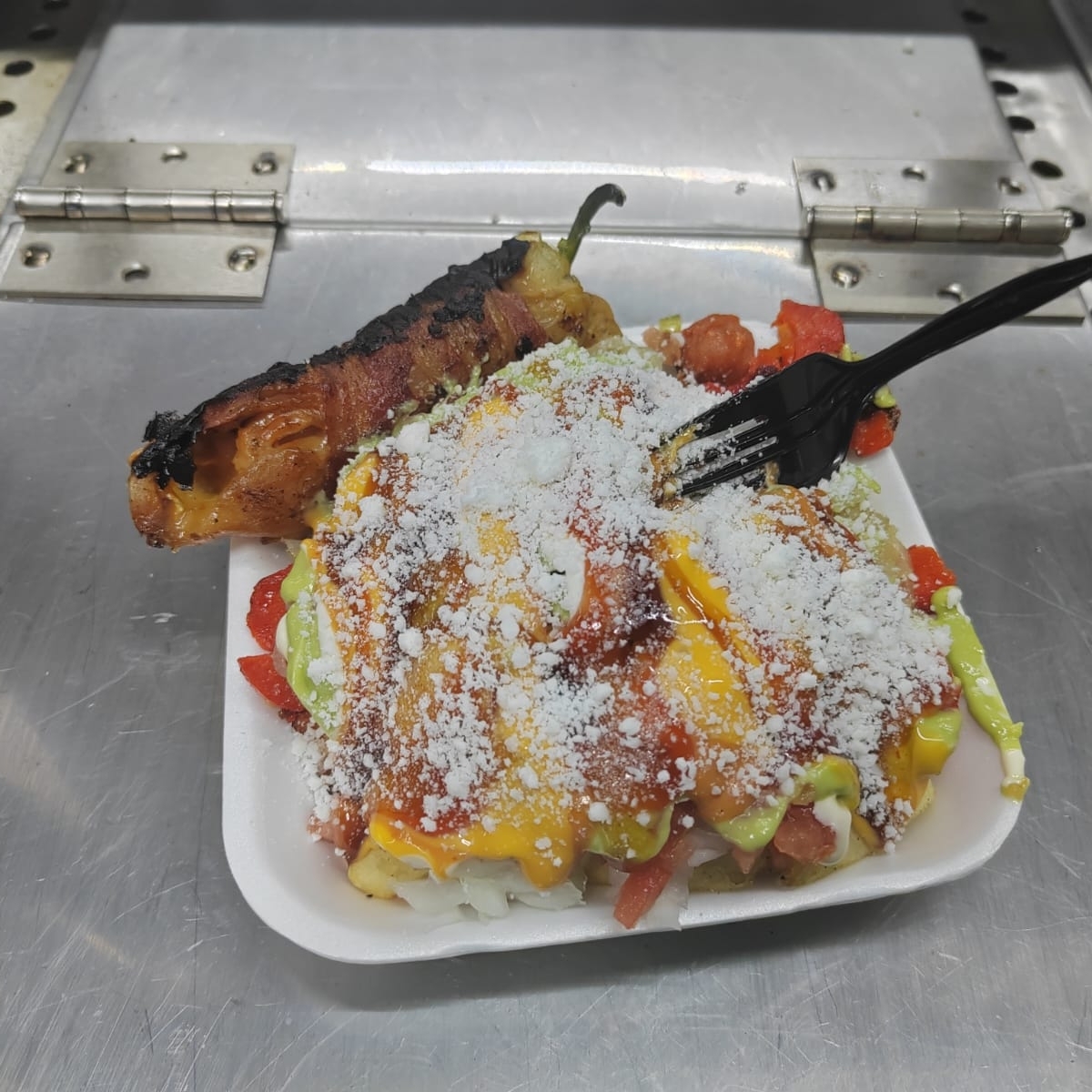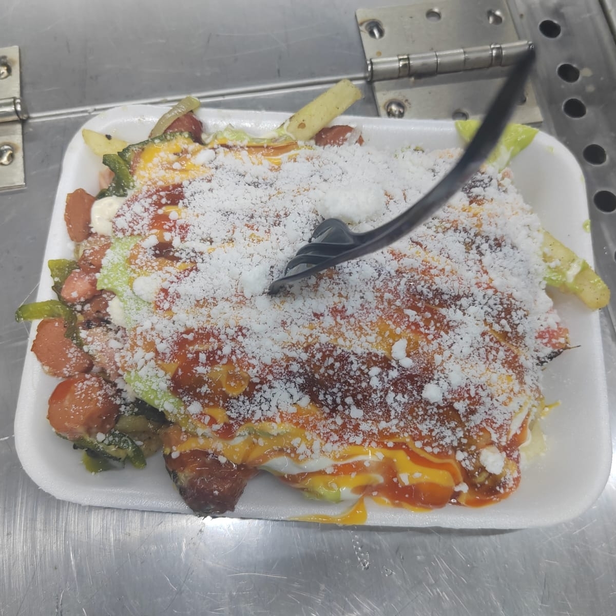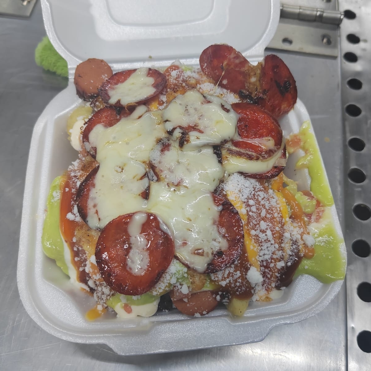 Salchicha con papas y pepperoni con queso gratinado, cebolla guisada cebolla cruda tomate aguacate queso rayado y aderesos