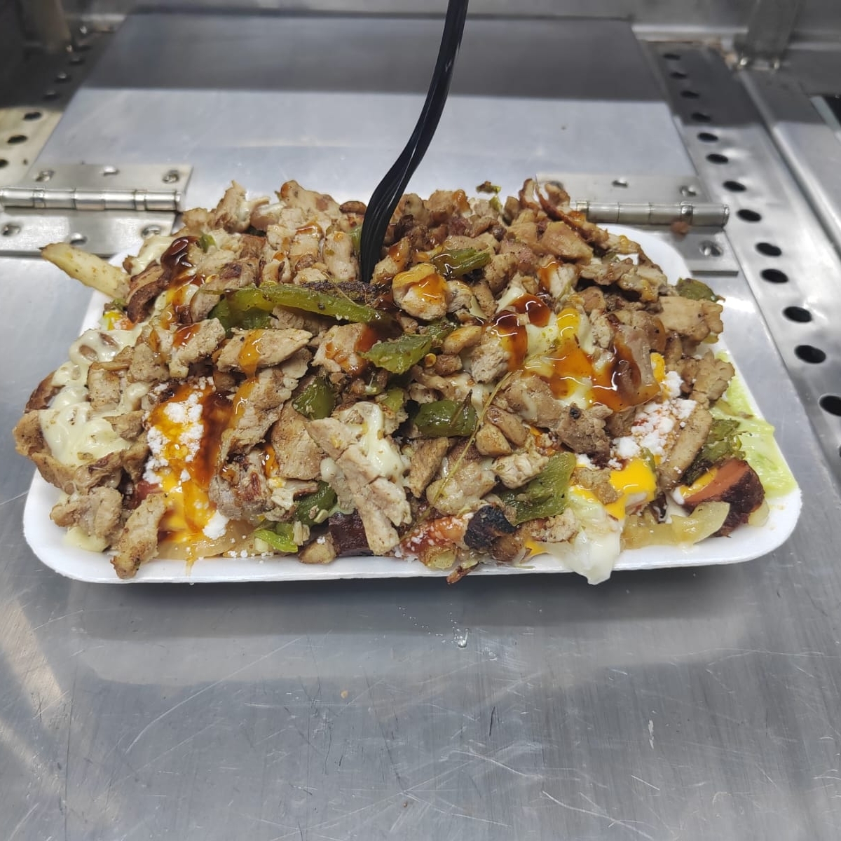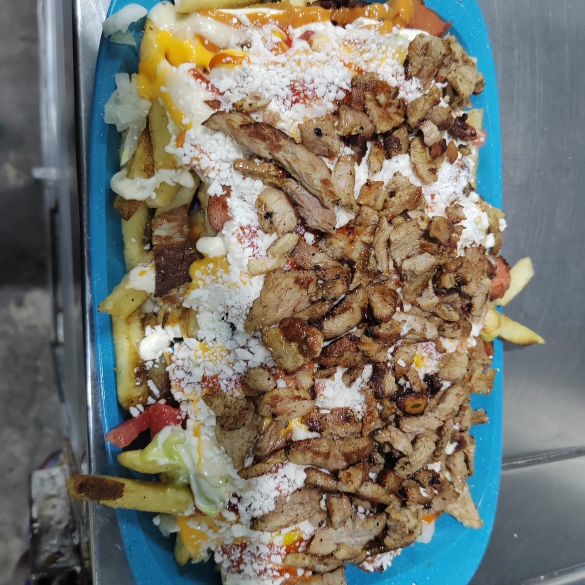 Salchicha con papas y pollo, cebolla guisada cebolla cruda tomate aguacate queso rayado y aderesos