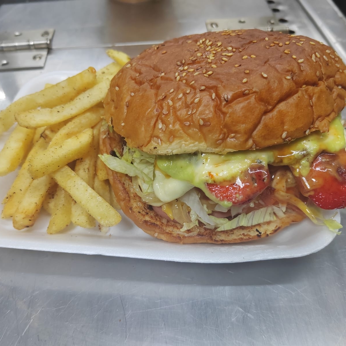 HAMBURGUESAS DE CAMARÓN,JAMON QUESO AMERICANO Y QUESO CHIHUAHUA,CEBOLLA , TOMATE, AGUACATE ,LECHUGA Y ADEREZOS