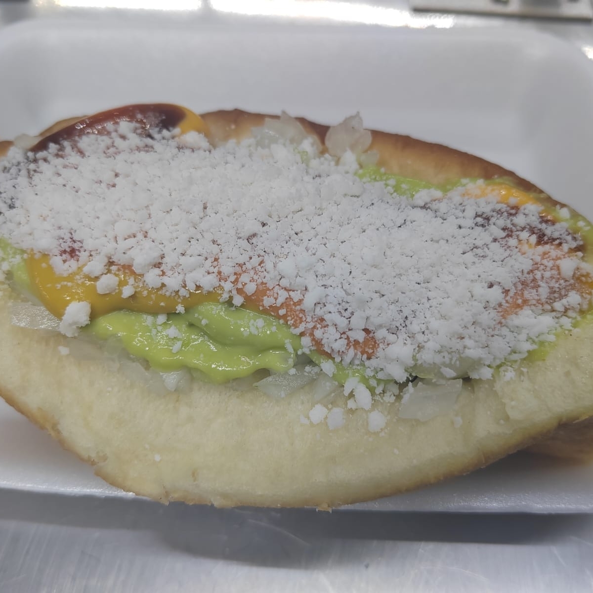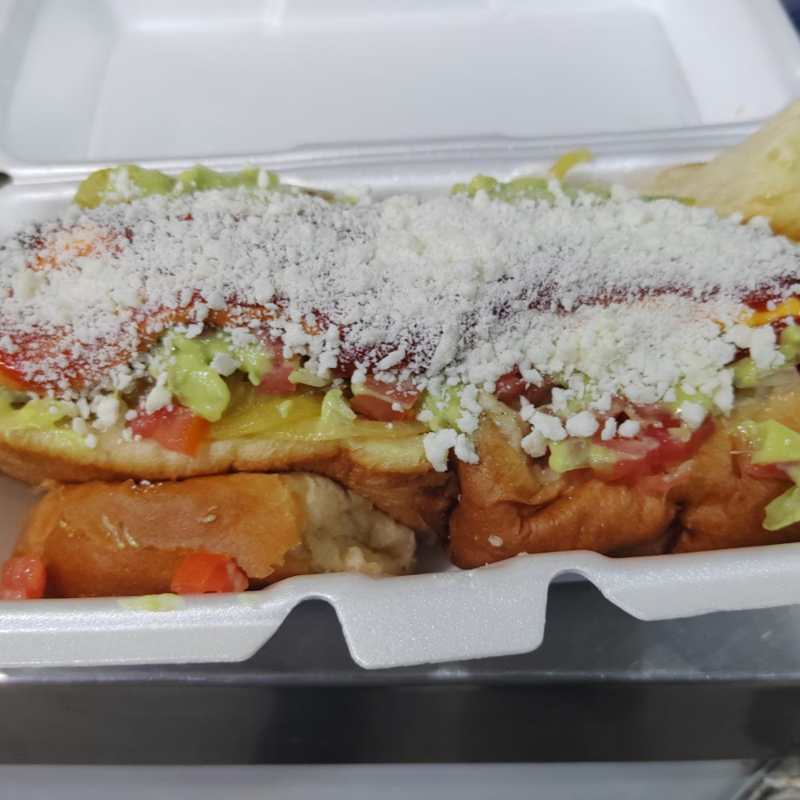 Salchicha con queso chihuahua, cebolla guisada, cebolla cruda, tomate, aguacate queso rayado y aderesos