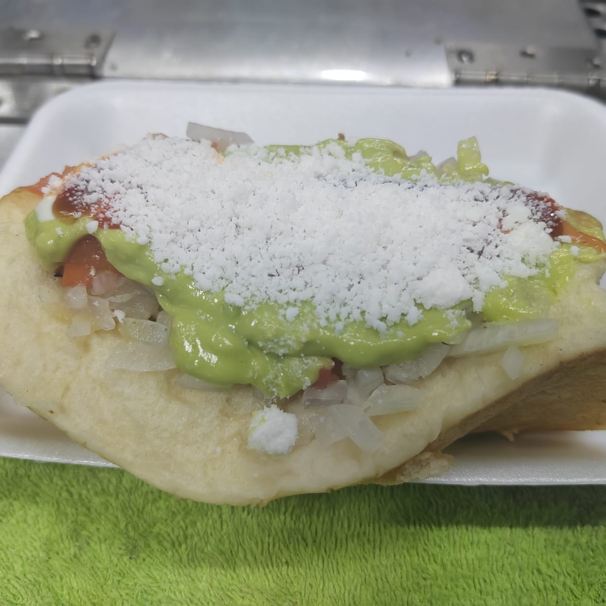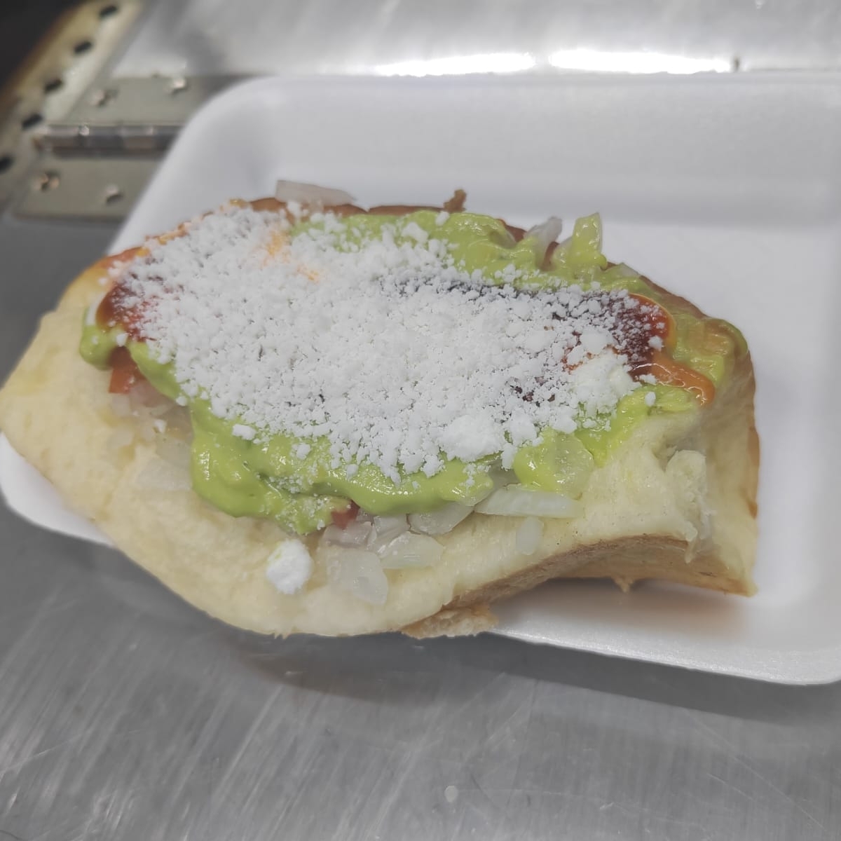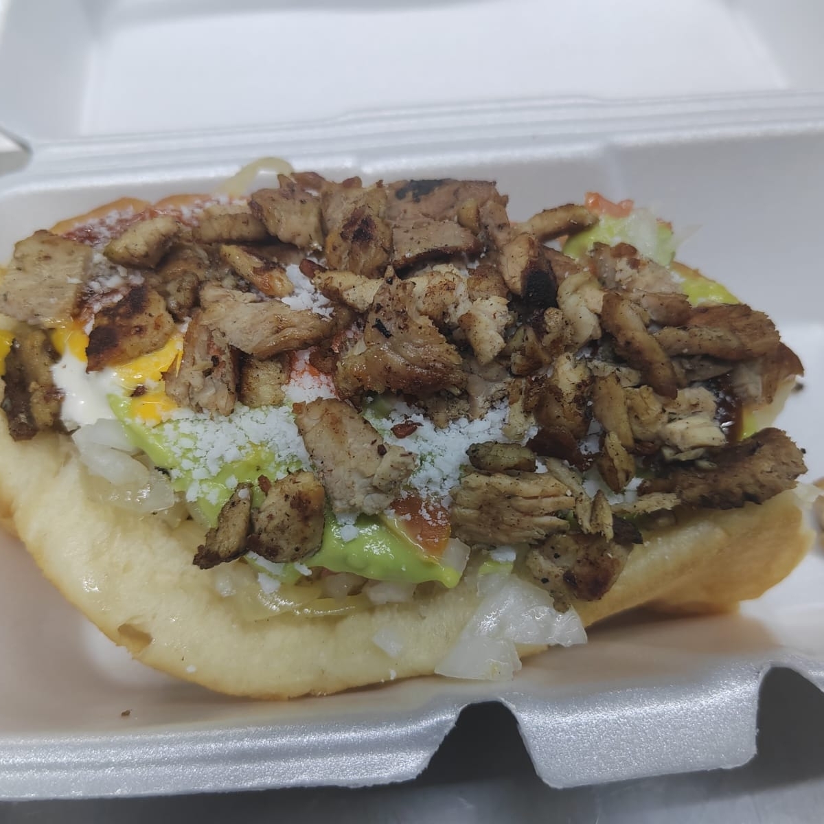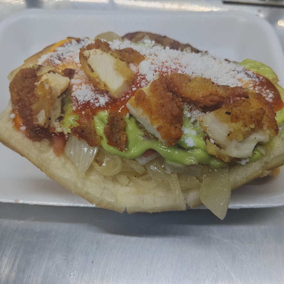 Pechuga de pollo, jamon con queso sanduichero, queso chihuahua, salchicha, acompañado de cebolla guisada, cebolla cruda, tomate, aguacate y queso rallado y aderesos