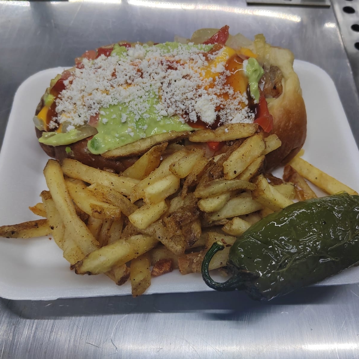 Chile Anaheim con salchicha y papas, cebolla guisada cebolla cruda tomate aguacate queso rayado y aderesos
