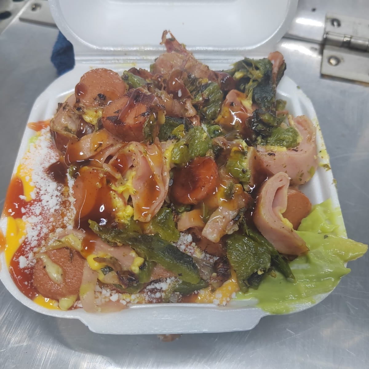 Jamón con queso sanduichero, queso chihuahua y salchicha, cebolla guisada, cebolla cruda, tomate, aguacate, queso rayado y aderesos
