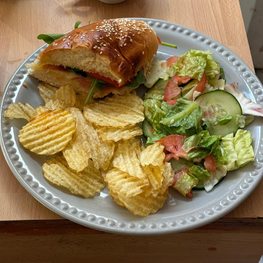 Sandwich de jamón serrano, manchego, arúgula y tomate