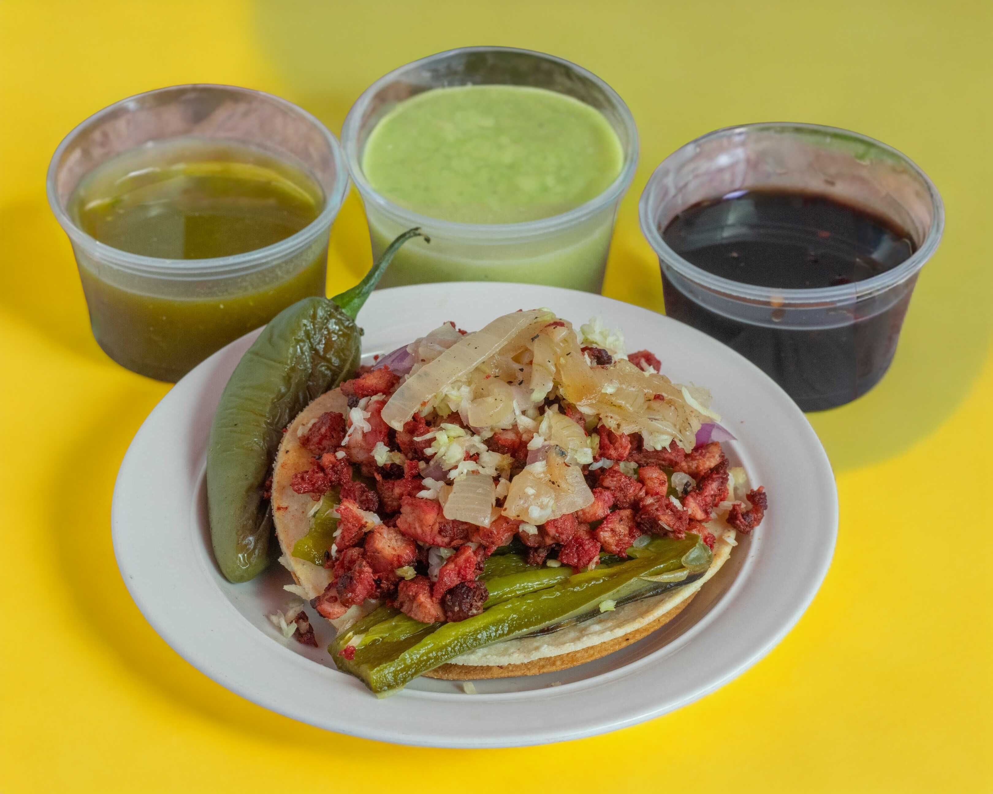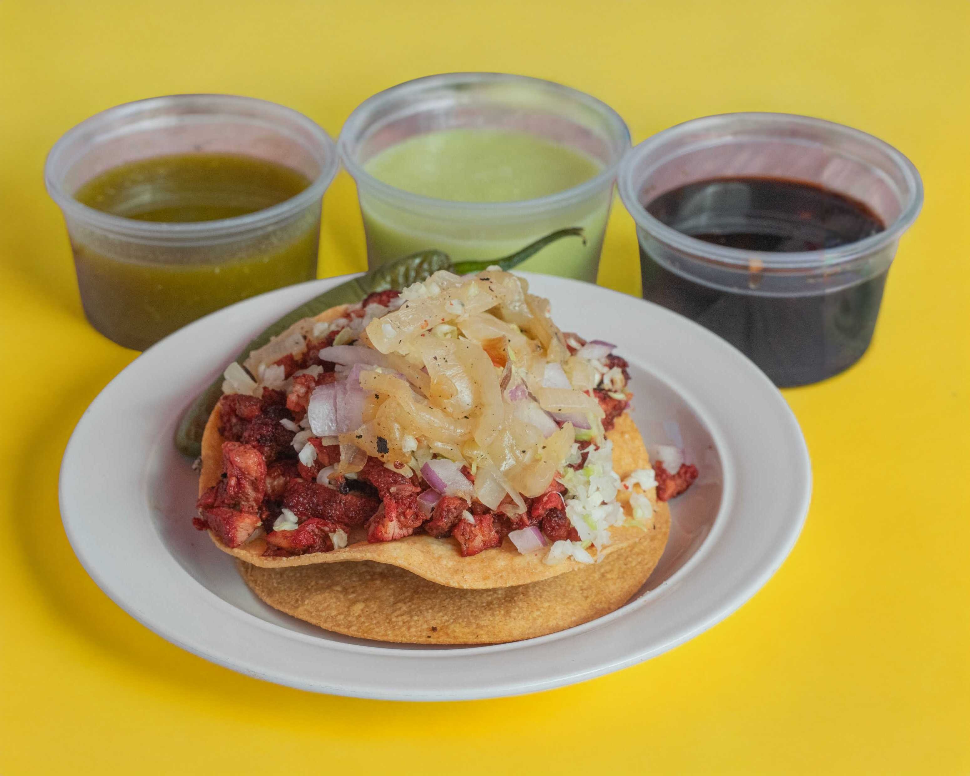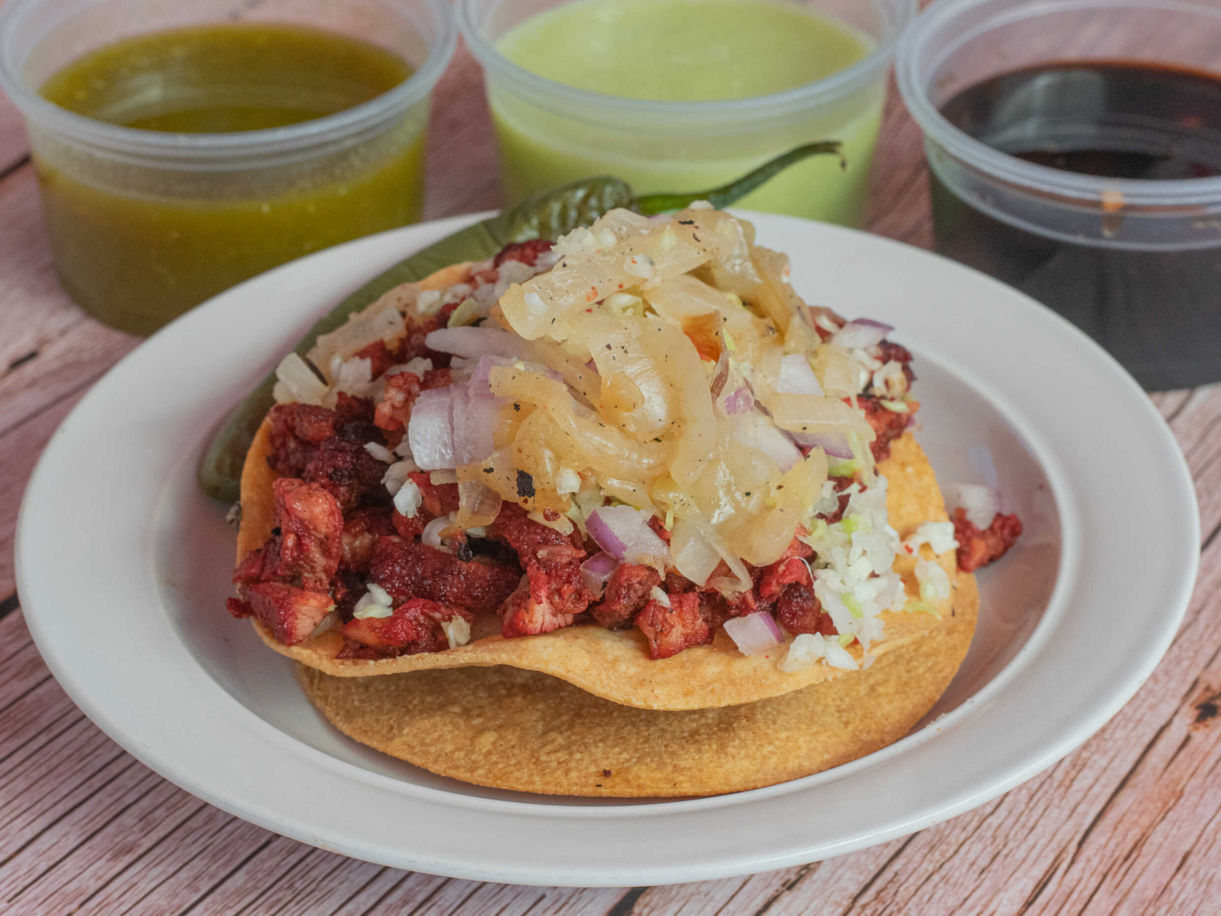 Tostadita con chile anaheim, carne adobada y gratinada.