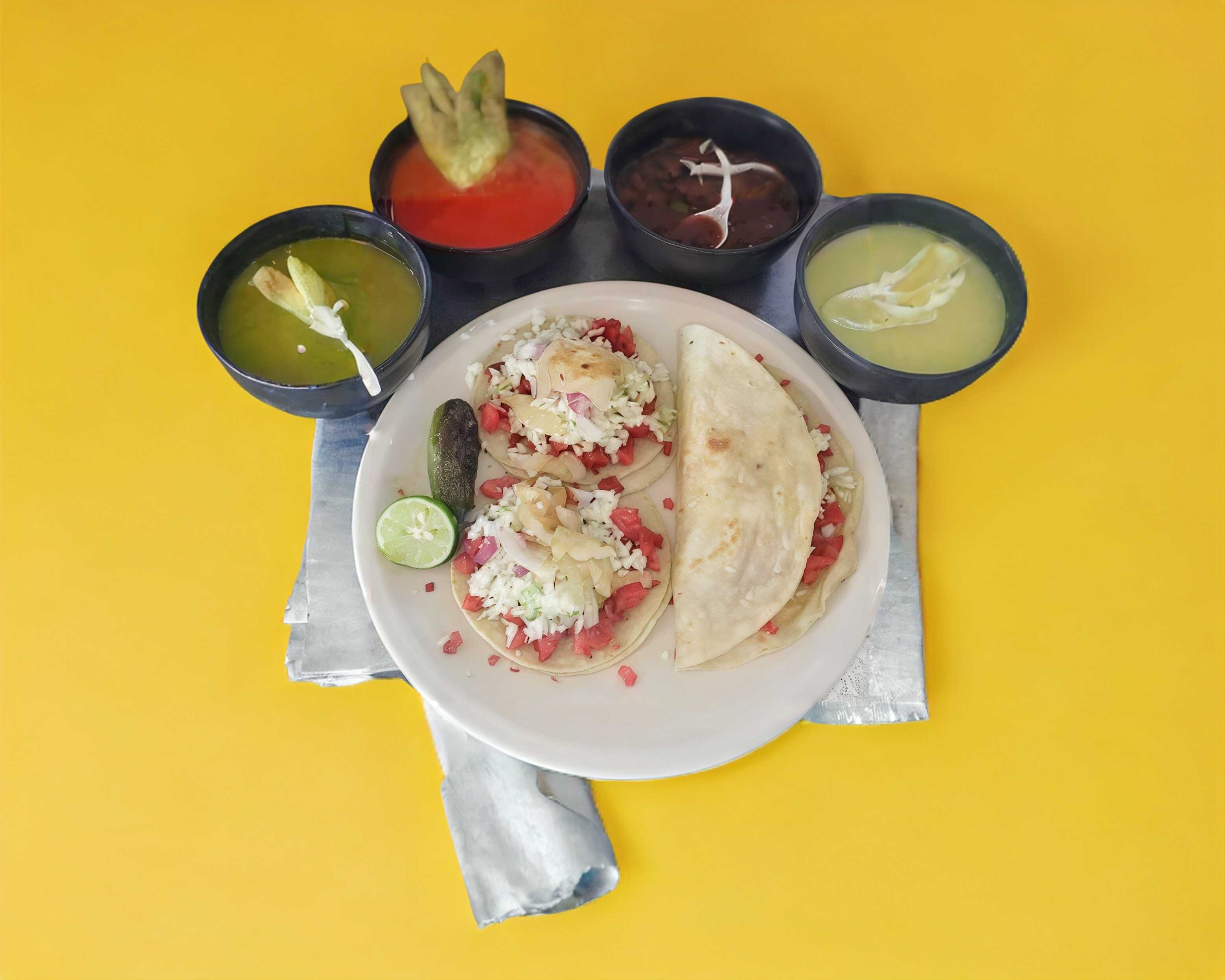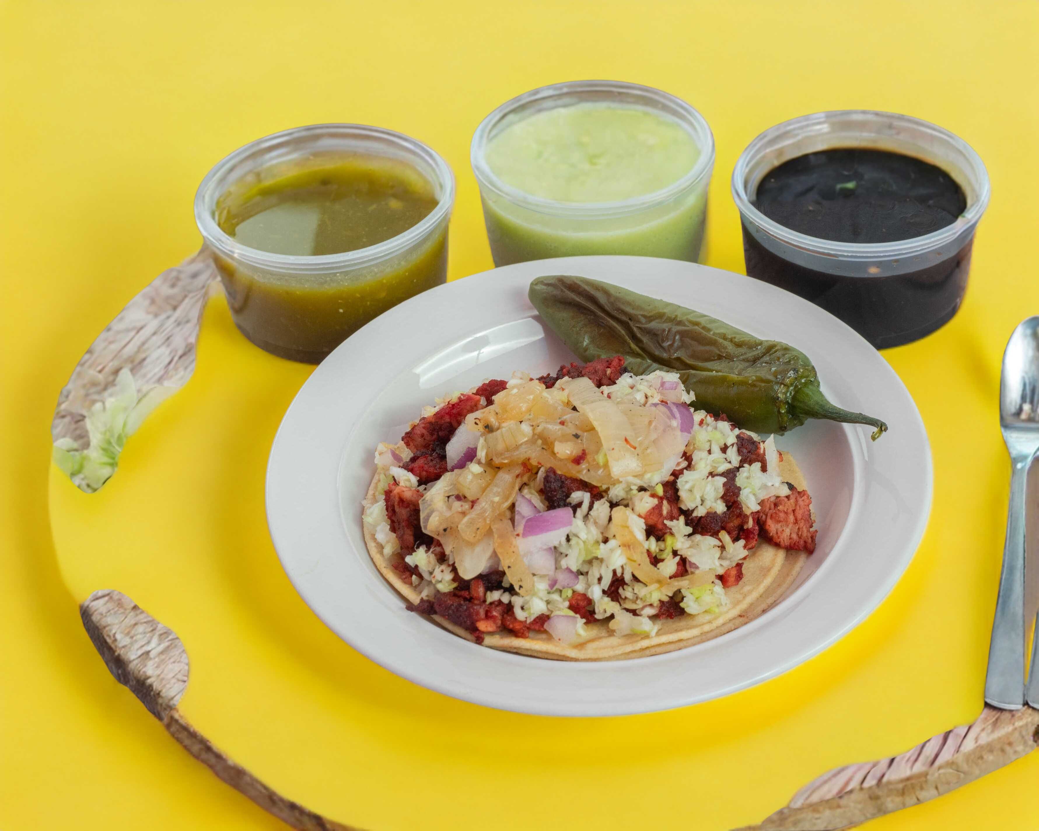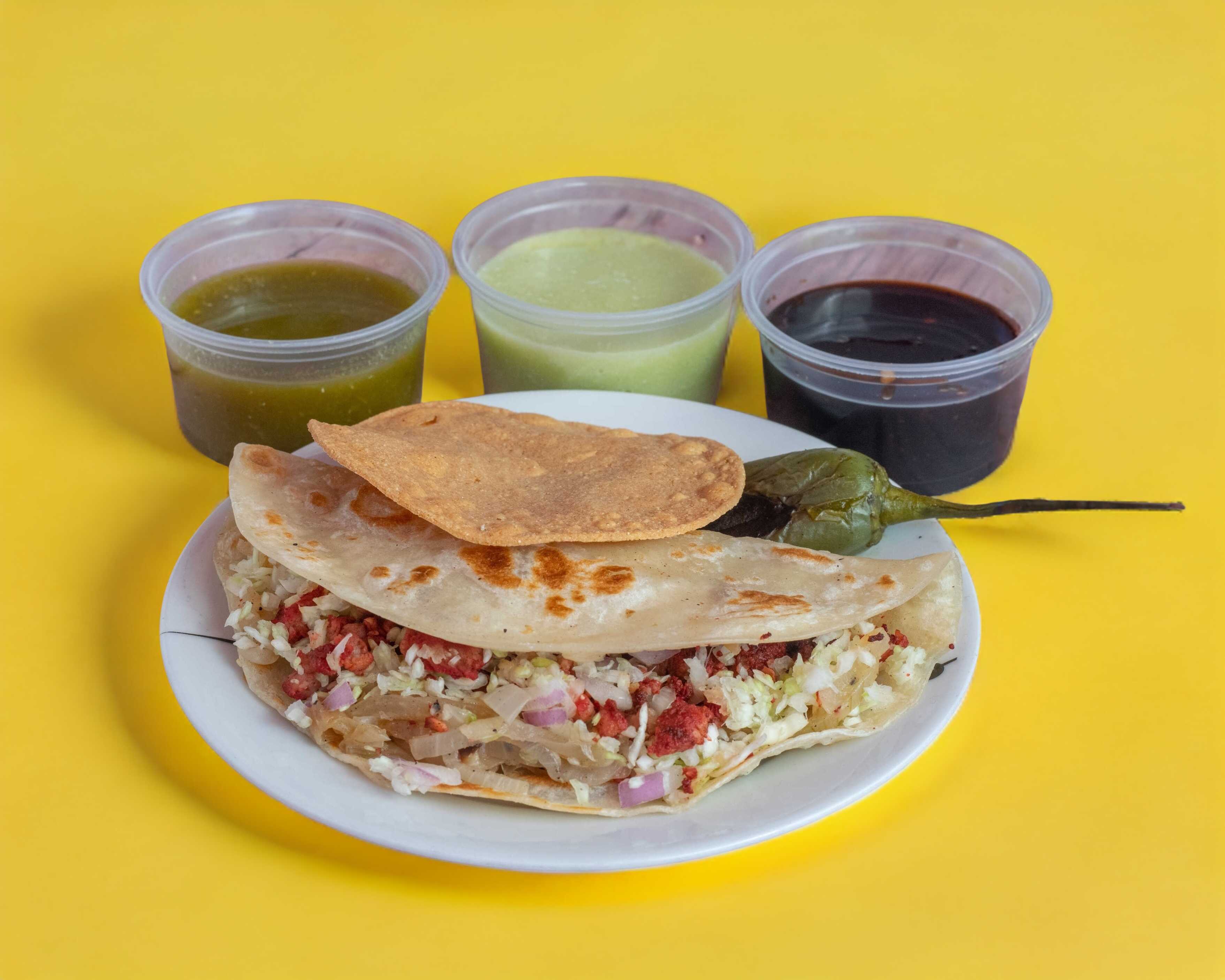 Tostadita con chile anaheim, carne adobada y gratinada.