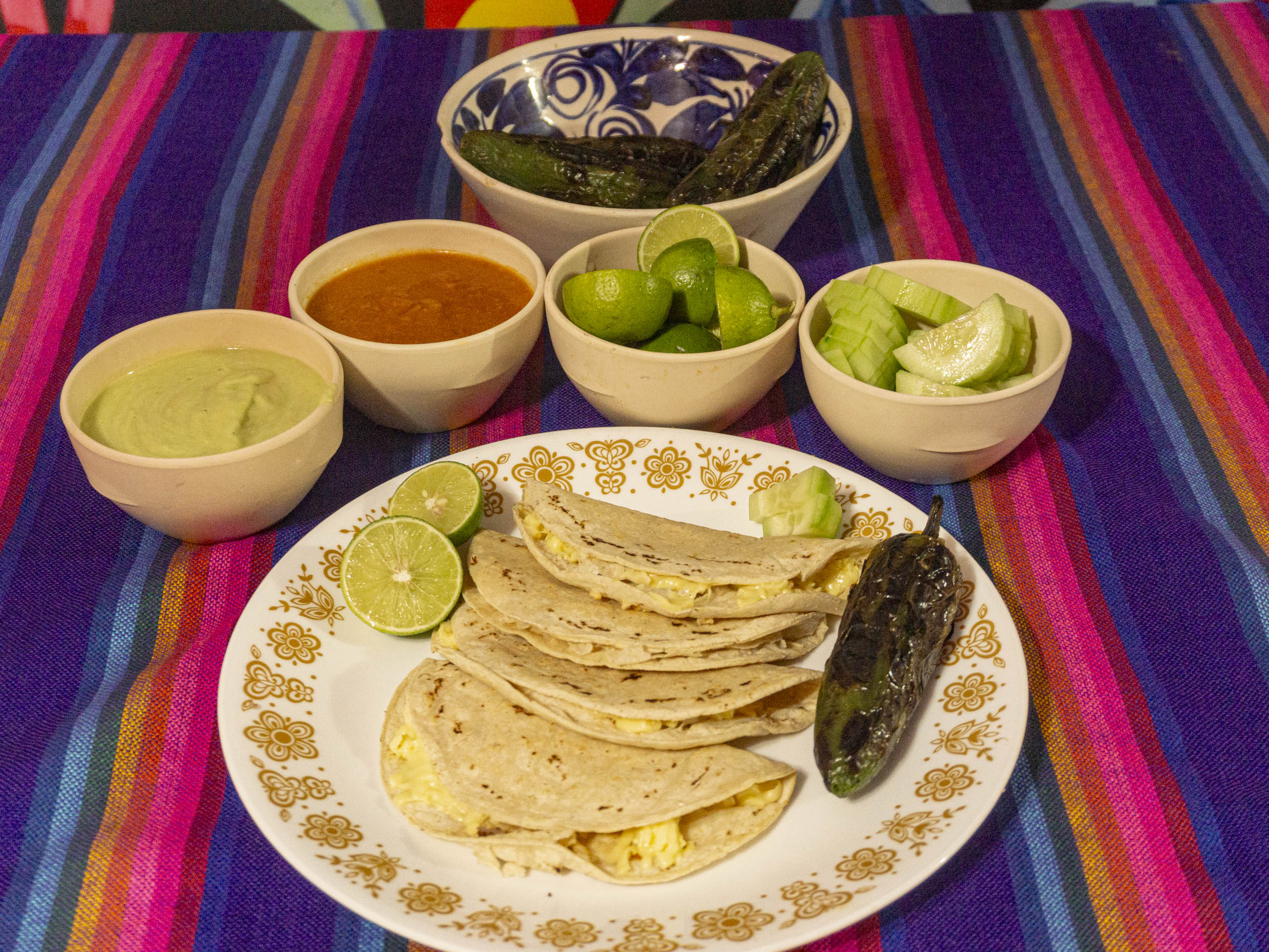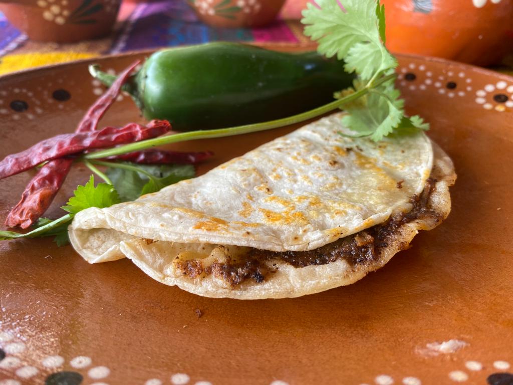 Tortilla de maíz ligeramente dorada rellena de queso