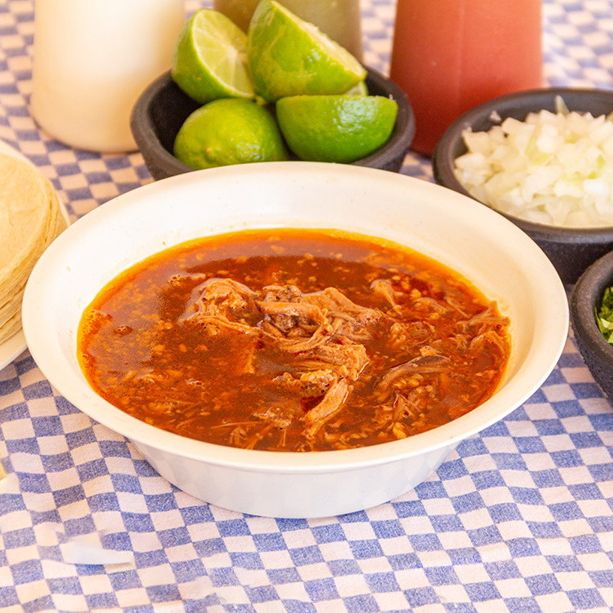 Carne de res con caldo de birria en envase de 1/2 litro acompañado de 6 tortillas de maíz. Incluye cebolla, cilantro, limón y salsa roja.