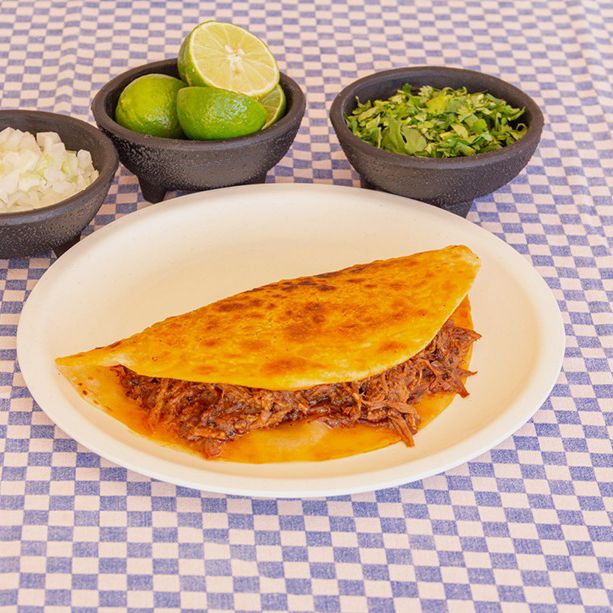 Tortilla de harina ligeramente dorada, rellena de birria de res y queso chihuahua, incluye cebolla, cilantro, limón, salsa verde y crema.