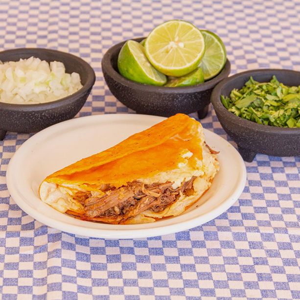 Tortilla de maíz ligeramente dorada rellena de carne de birria de res, incluye cebolla, cilantro, limón, salsa verde y crema.
