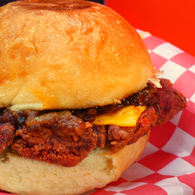 Cama de Bongles en salsa de tu Elección, con Queso Americano, Mermelada de tocino & Cebolla Morada caramelizada, en pan brioche con aderezo chipotle y papas a elección.
