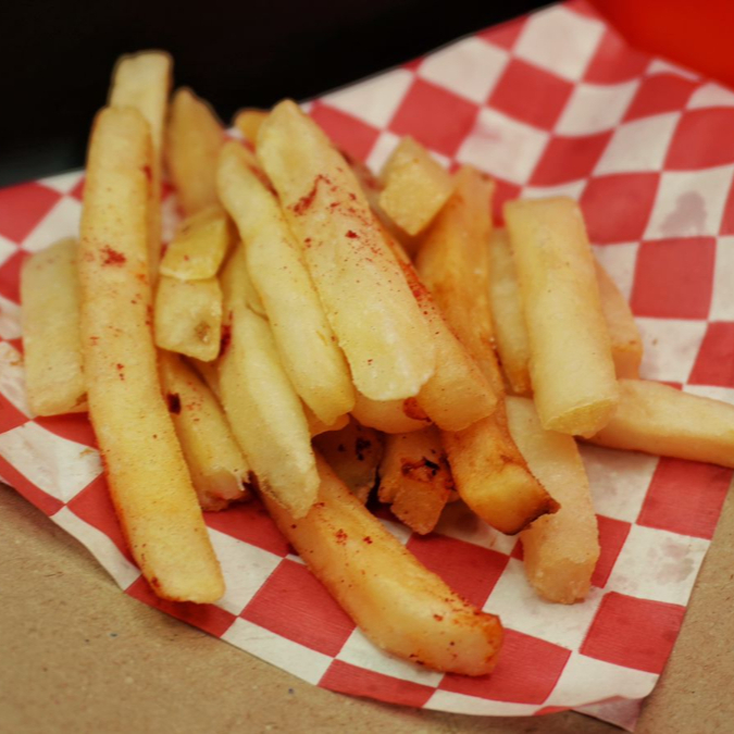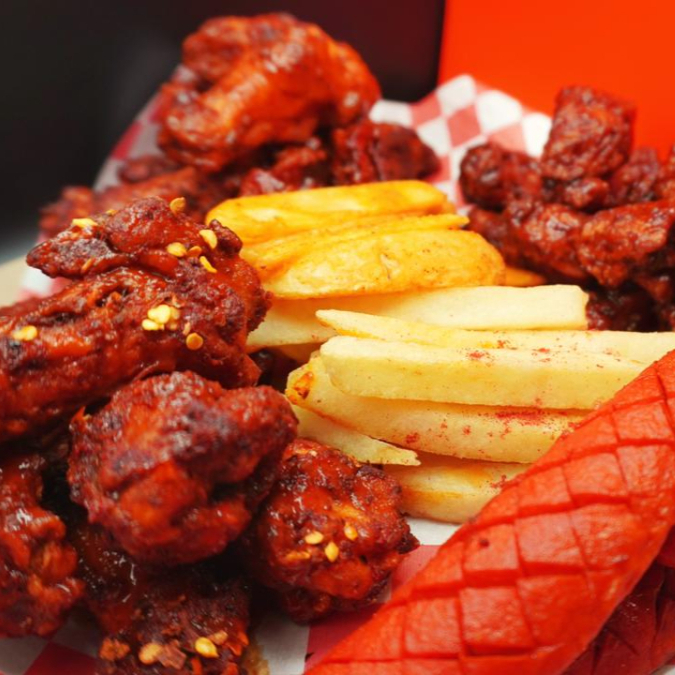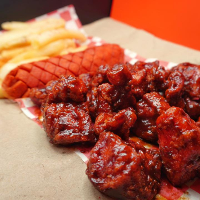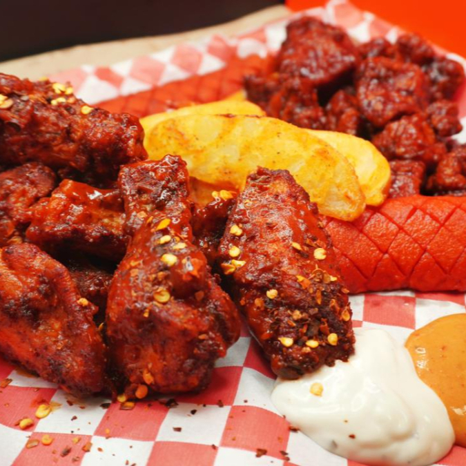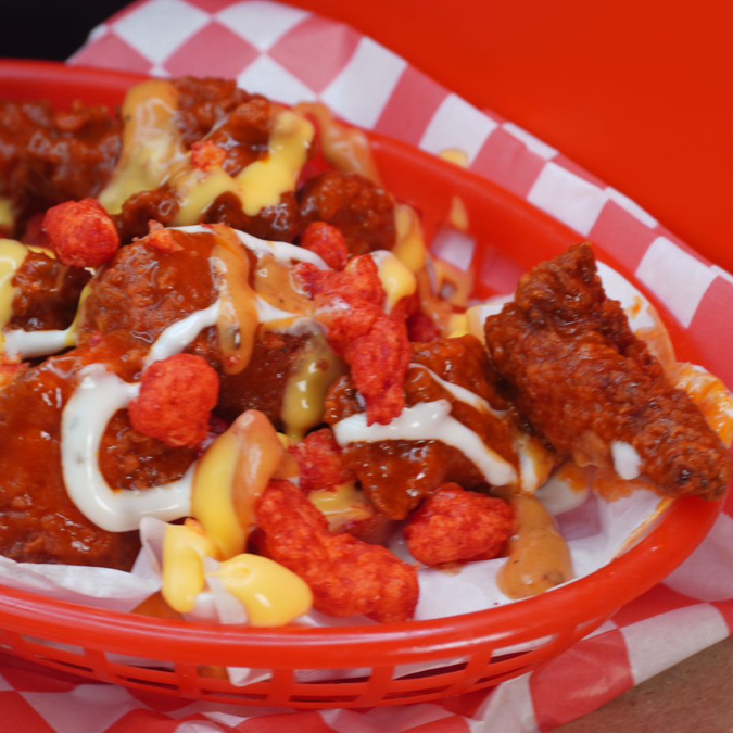 Boneless bañados con salsa a elección, en cama de papas a elección, aderezo cheez whiz, ranch y chipotle, coronado con cheetos flaminhot y salchicha roja picada.