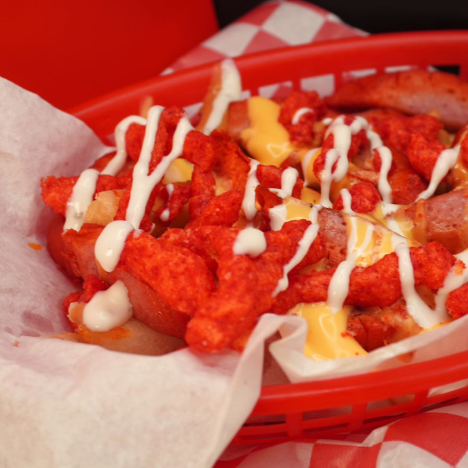 Papas a elección con cheez whiz, aderezo Ranch y Chipotle, acompañado de Salchicha Roja picada, coronado con Cheetos flaminhot.