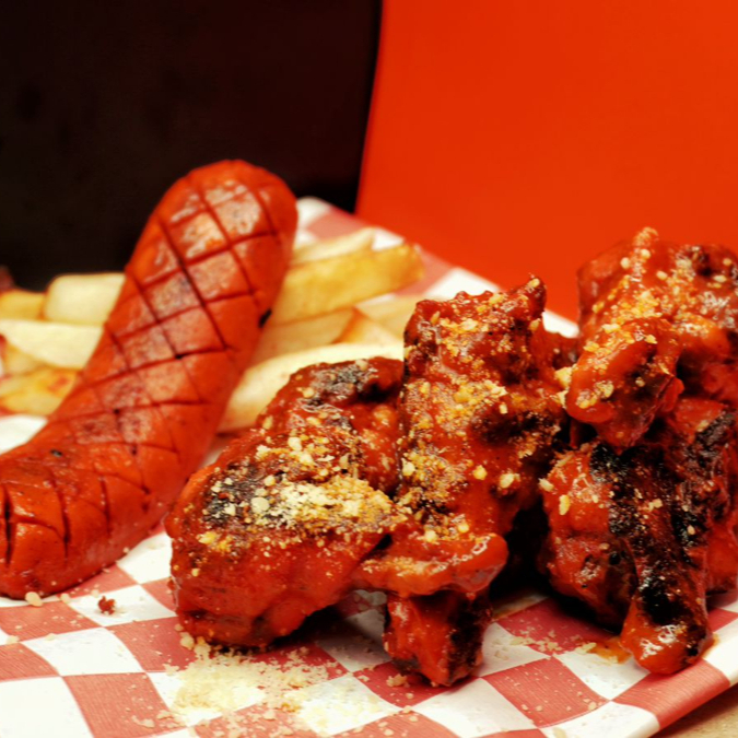 3 ordenes boneless y/o alitas con 3 salchichas rojas, 3 oz aderezos ranch y chipotle, Elige tu salsa(s) (MIXTO ESPECIFICAR)y de ambas papas.