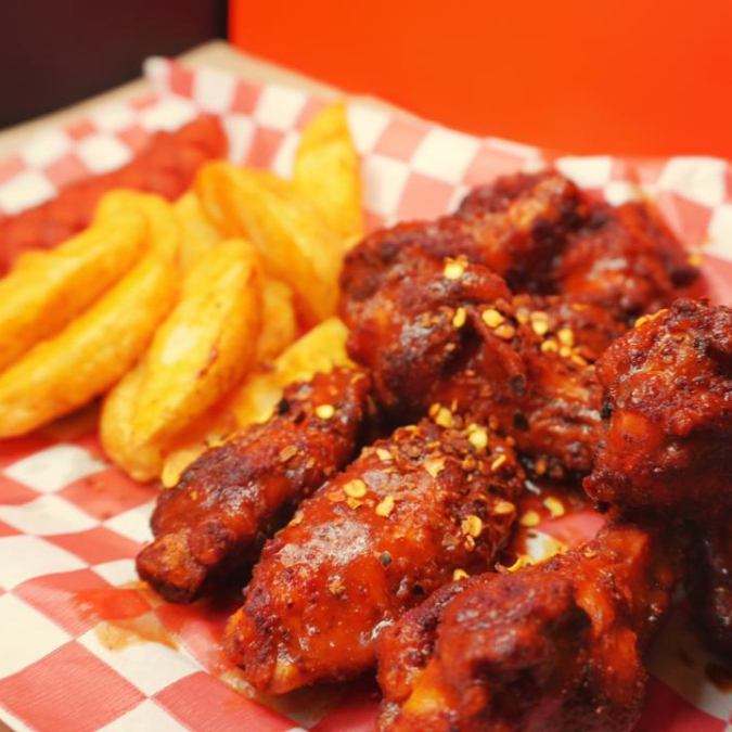 Orden de Alitas acompañada con salchicha roja, 1 oz de ranch, 1 oz aderezo chipotle, salsa y papas a elegir, 1 orden.