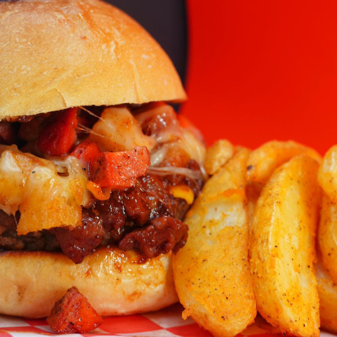 Arrachera burguer con Queso Americano, Coronado de Fundido de Queso Con Salchicha Roja y Aros de Cebolla Picada; Mermelada de tocino & Cebolla Morada caramelizada, en pan brioche con aderezo chipotle y papas a elección.