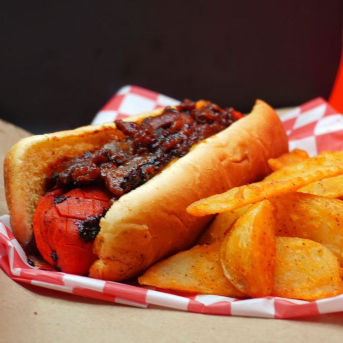 Salchicha Roja al Grill, en Pan Doguero Brioche con aderezo chipotle, Queso Americano, coronado con Mermelada de Tocino & Cebolla