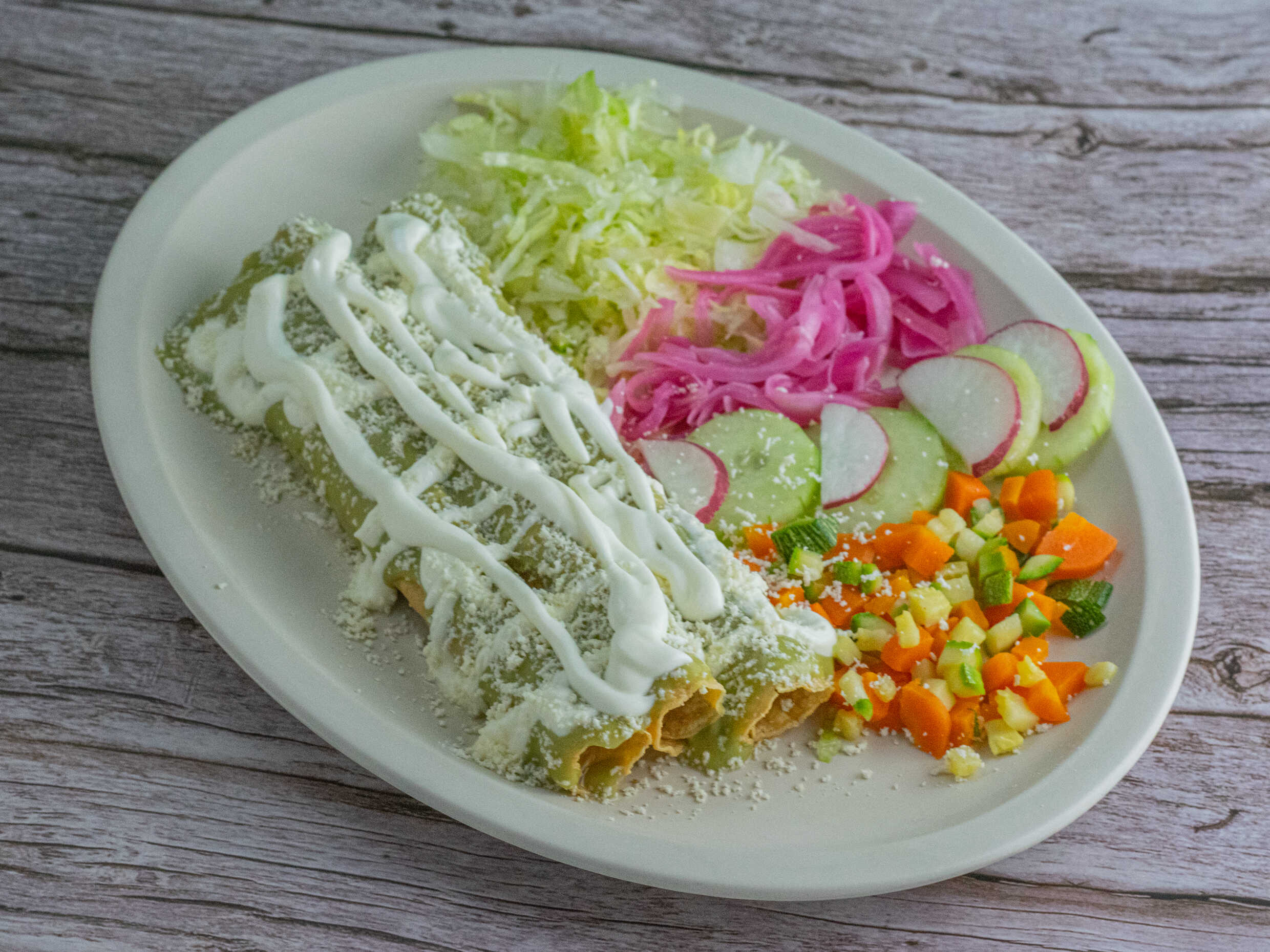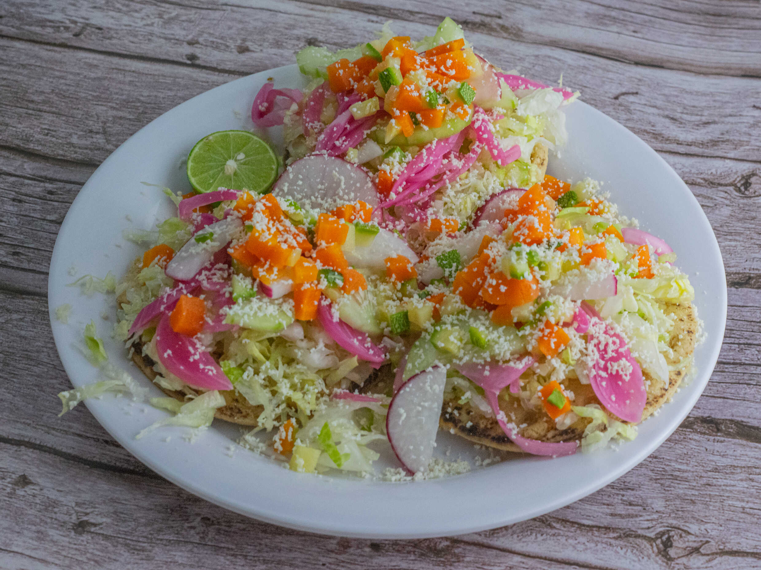 Tortilla delgada dorada relleno de carne. arriba lechuga, cebolla, pepino, zanahoria, calabaza, queso