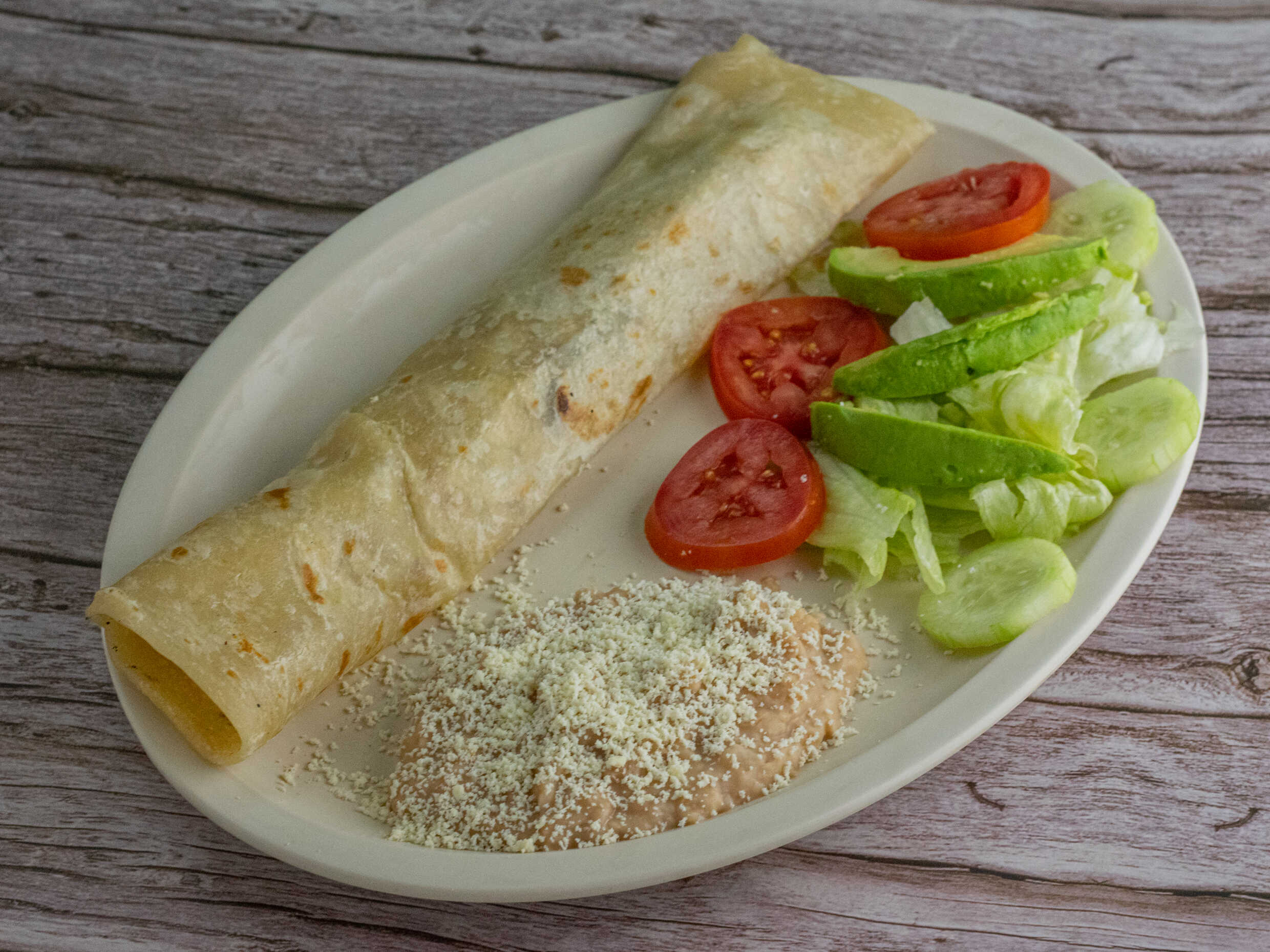 Tortilla de harina de 33 Cms, con una orden de carne machaca, guarnición de frijol y ensalada