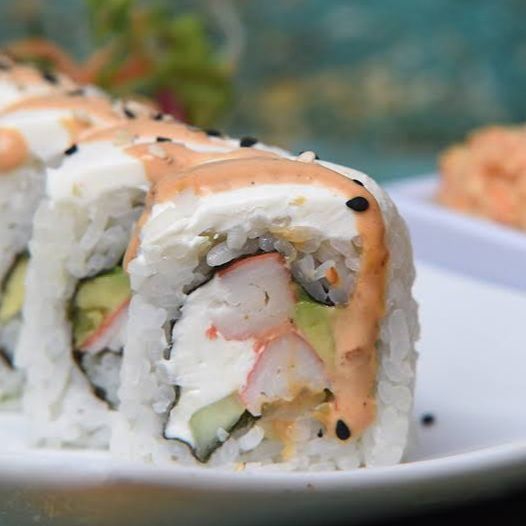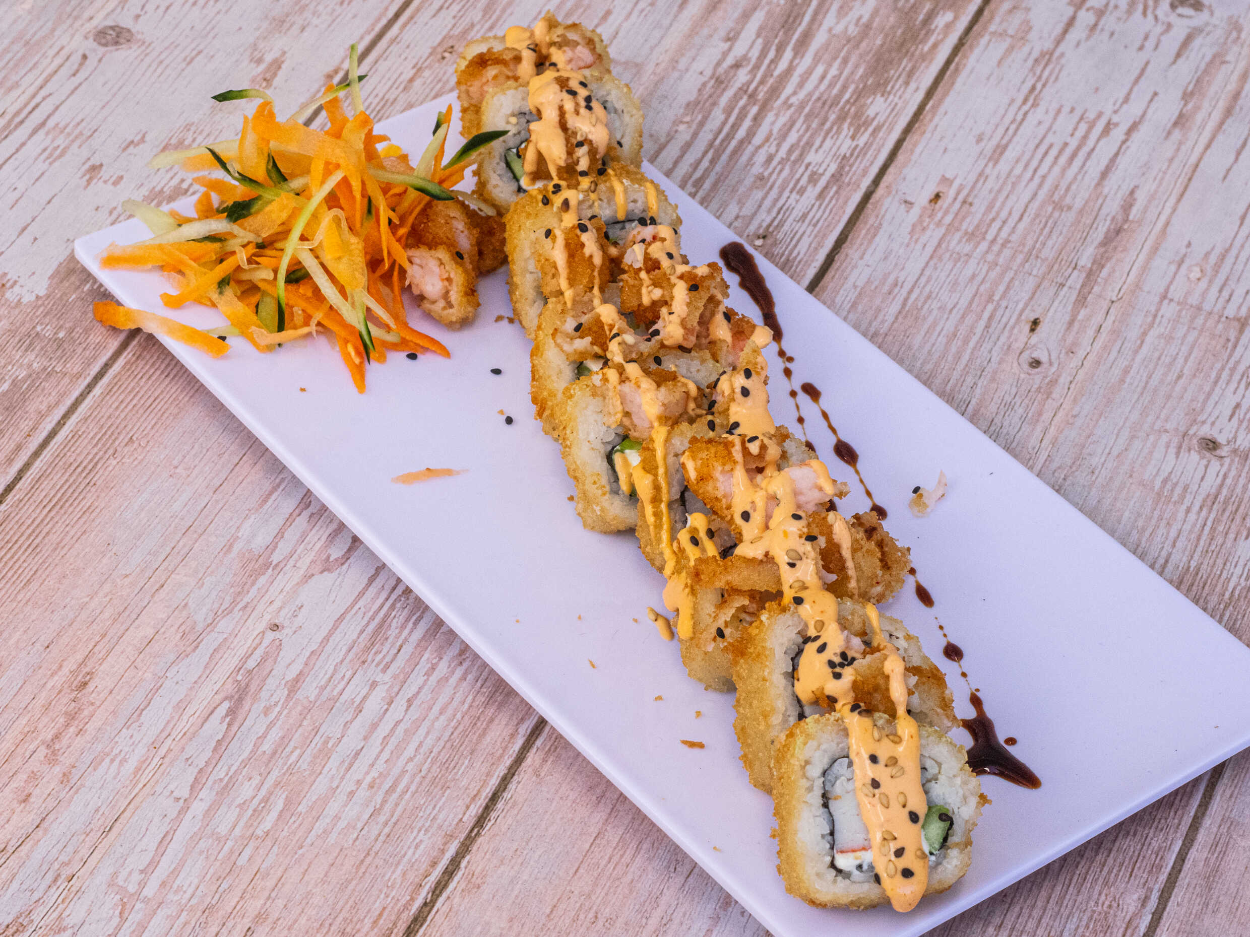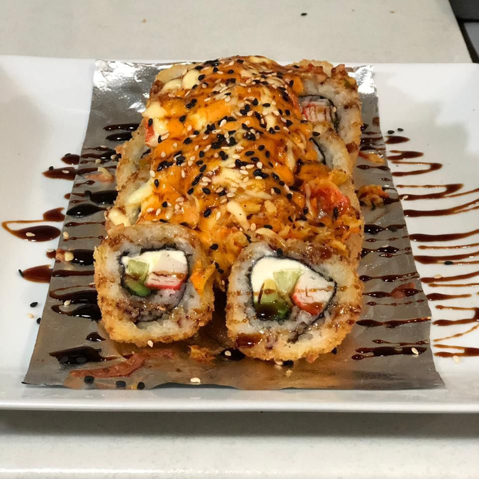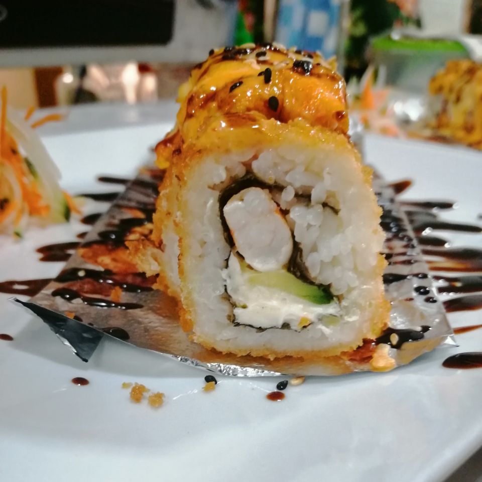 Rollo de cangrejo, relleno de philadelphia, aguacate, pepino. Por fuera trositos de camarón empanizado, bañados con salsa spacy y ajonjolí.