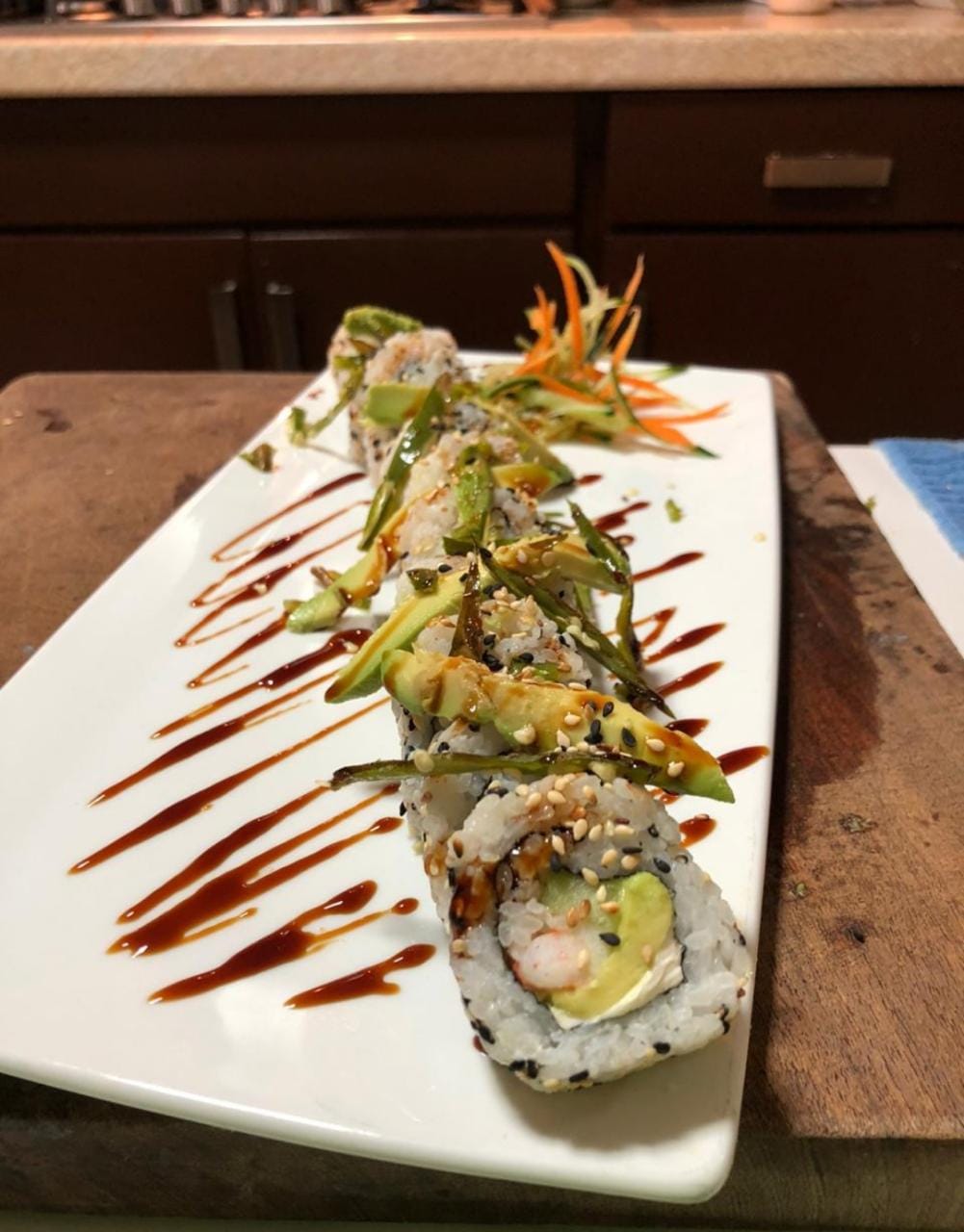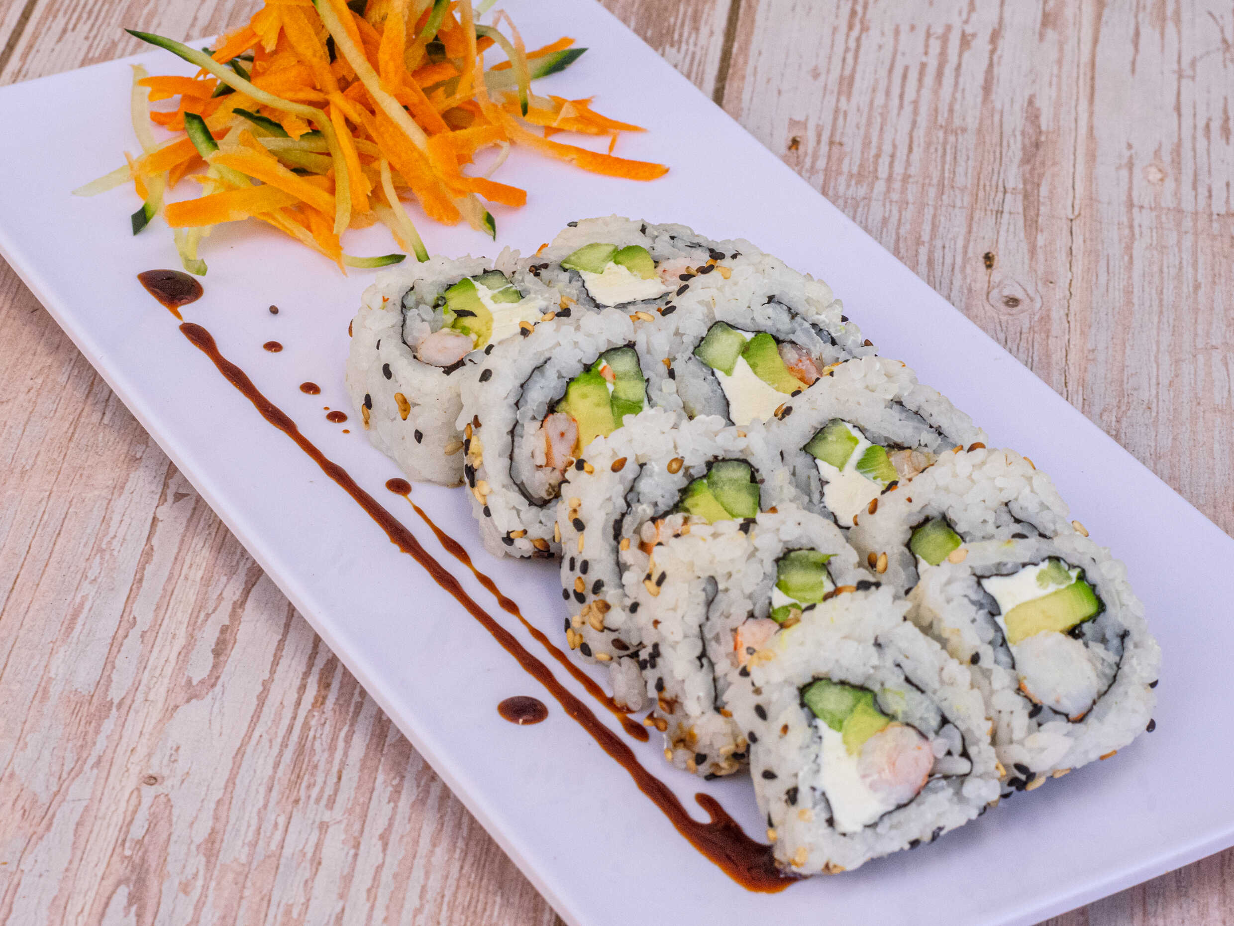 Rollo natural de camarón cubierto de aguacate acompañado con topping de Tampico.