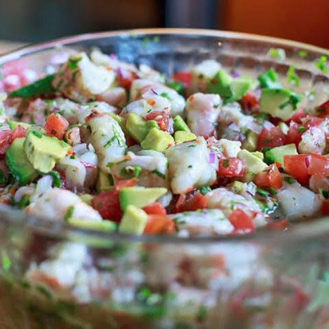 Ceviche de Camarón curtido con verdura fresca y aguacate.