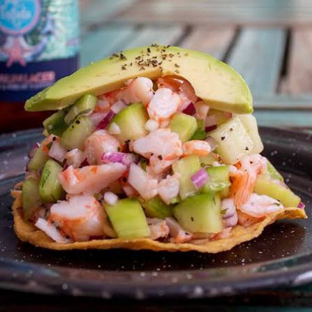 Rica tostada de ceviche camarón cocido con aguacate y salsa especial.