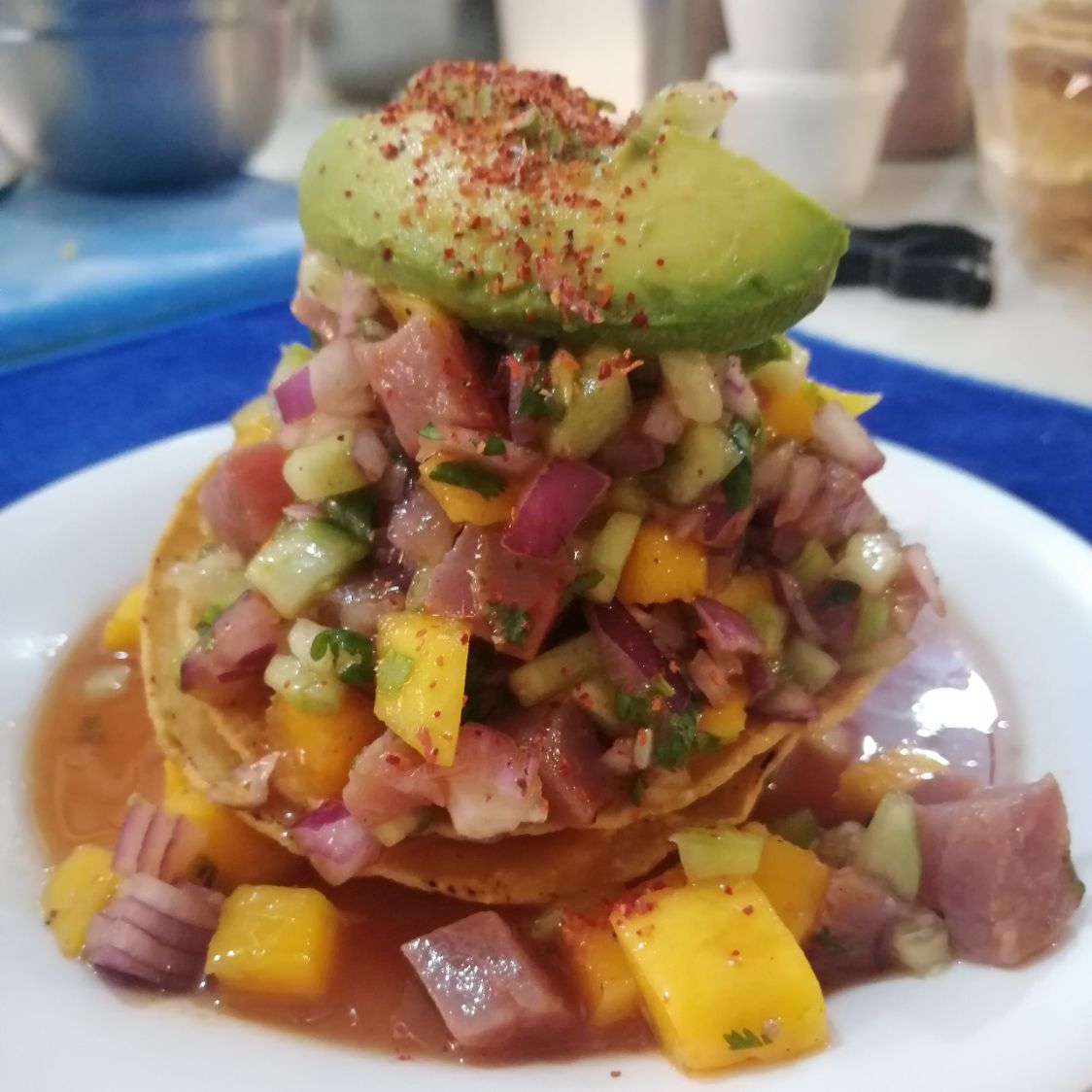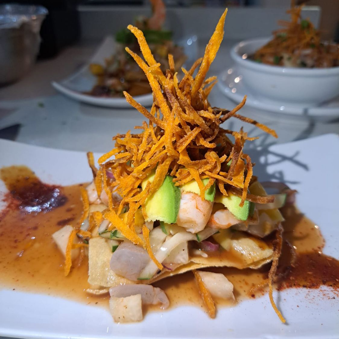 Mixt de Ceviche con Camarón cocido, camarón curtido, medallón de atún en cubos con cebolla y pepino juliana, fritura de zanahoria, aguacate y salsa de la casa.