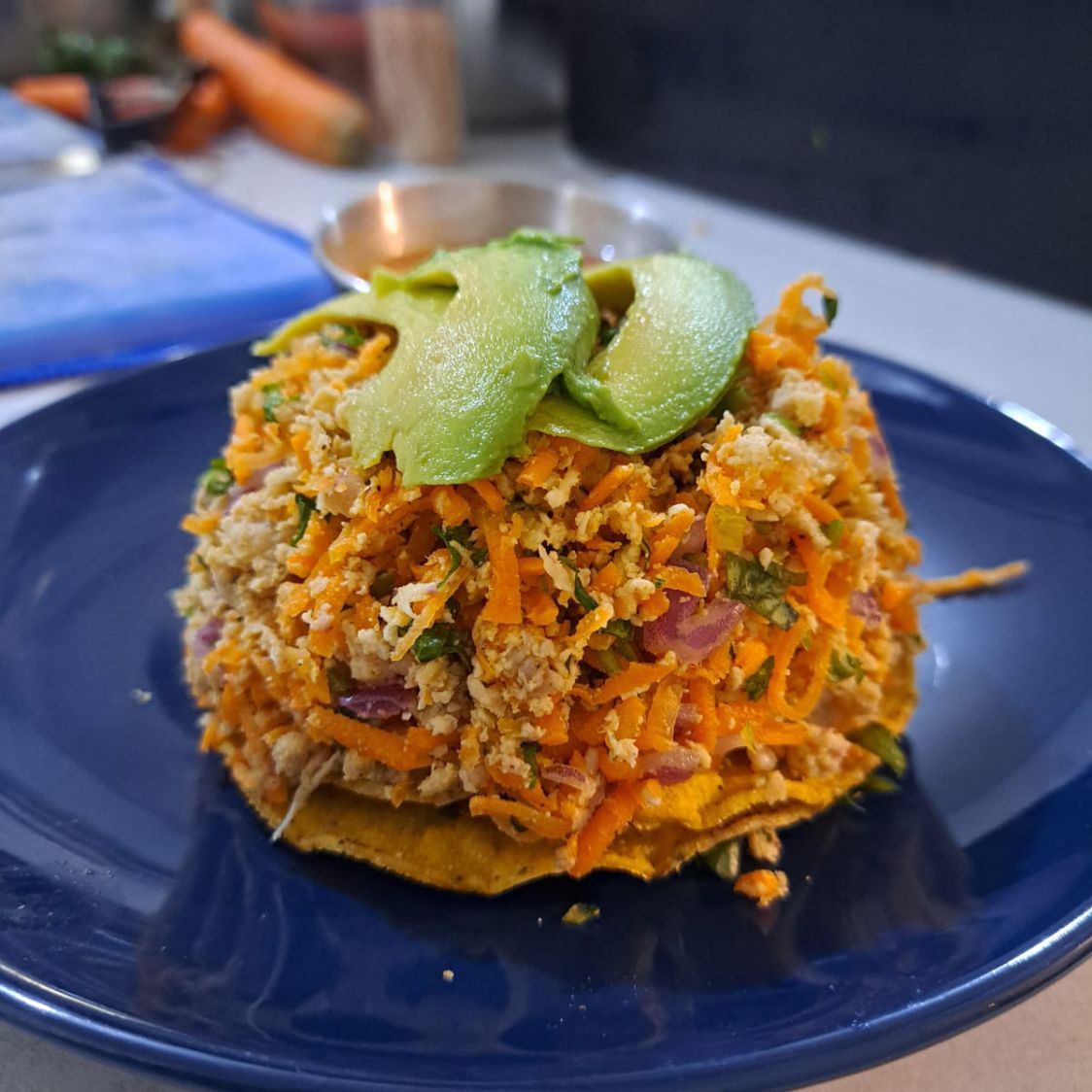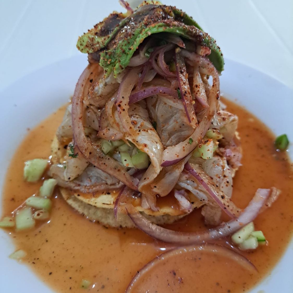 Mezclada con salsa de la casa, cebolla juliana, pepino, aguacate tostada redonda y salsa de la casa.