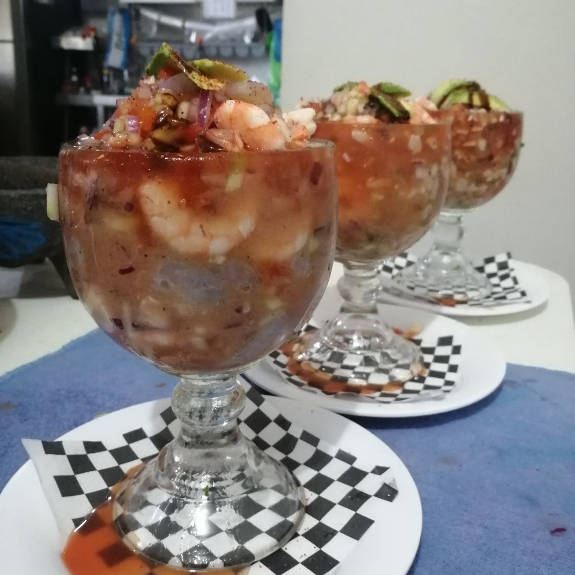 1/2 litro de Rico cóctel con camarón cocido, callo de pescado, camarones ahogados, pepino, tomate, cebolla y aguacate. Ya incluye tostadas y salsa pirata.