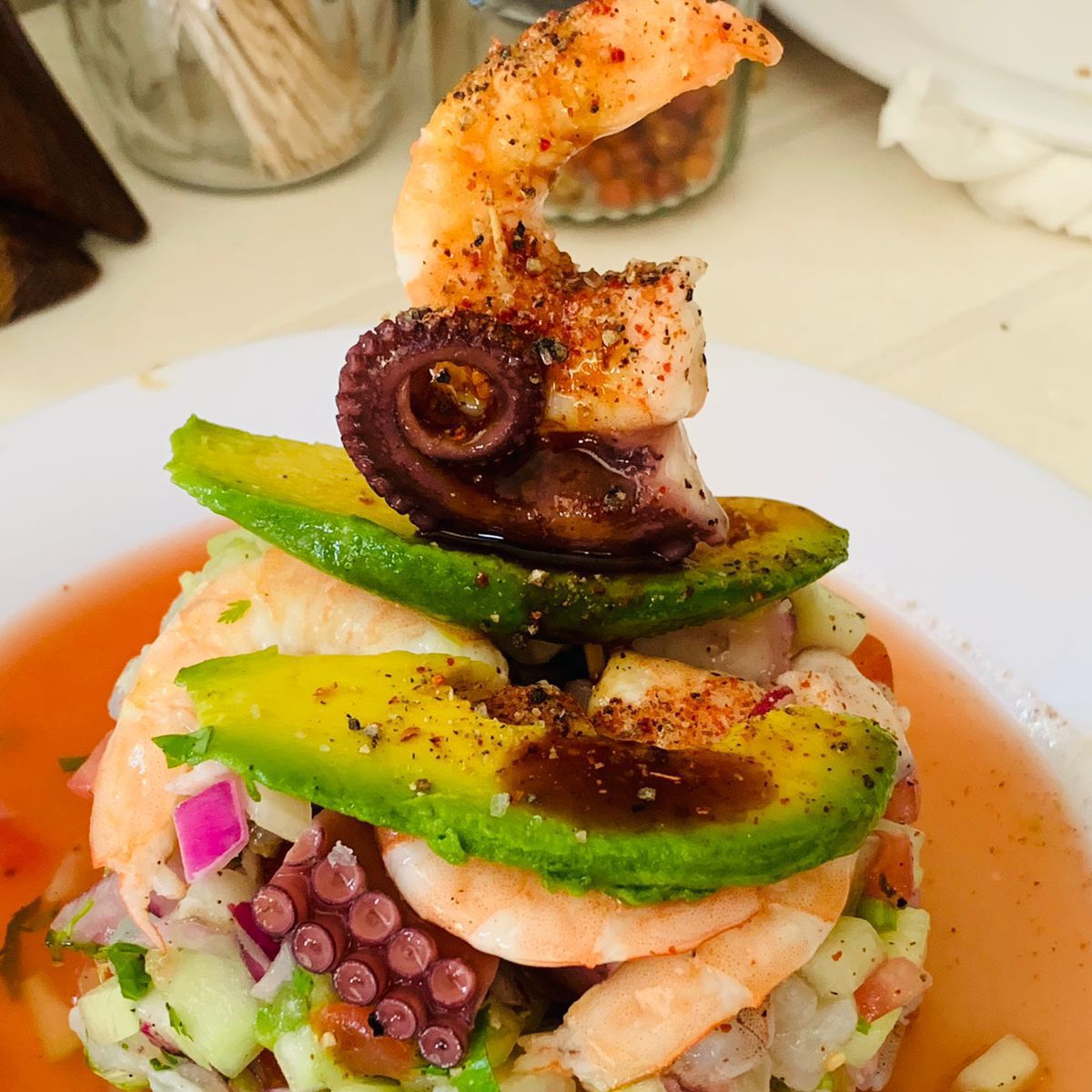 1/2 litro de camarón cocido en trozo, callos de lobina, ostión, ceviche de pescado, aguacate e Incluye tostadas, y salsa de la casa.