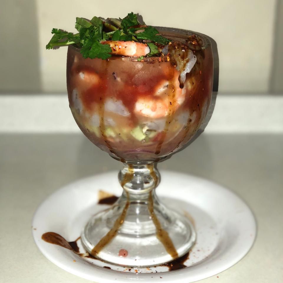 1/2 orden Ceviche de Camaron cocido en cubos verdura fresca con clamato preparado, rodajas de aguacate acompañado de totopos y salsa de la casa.
