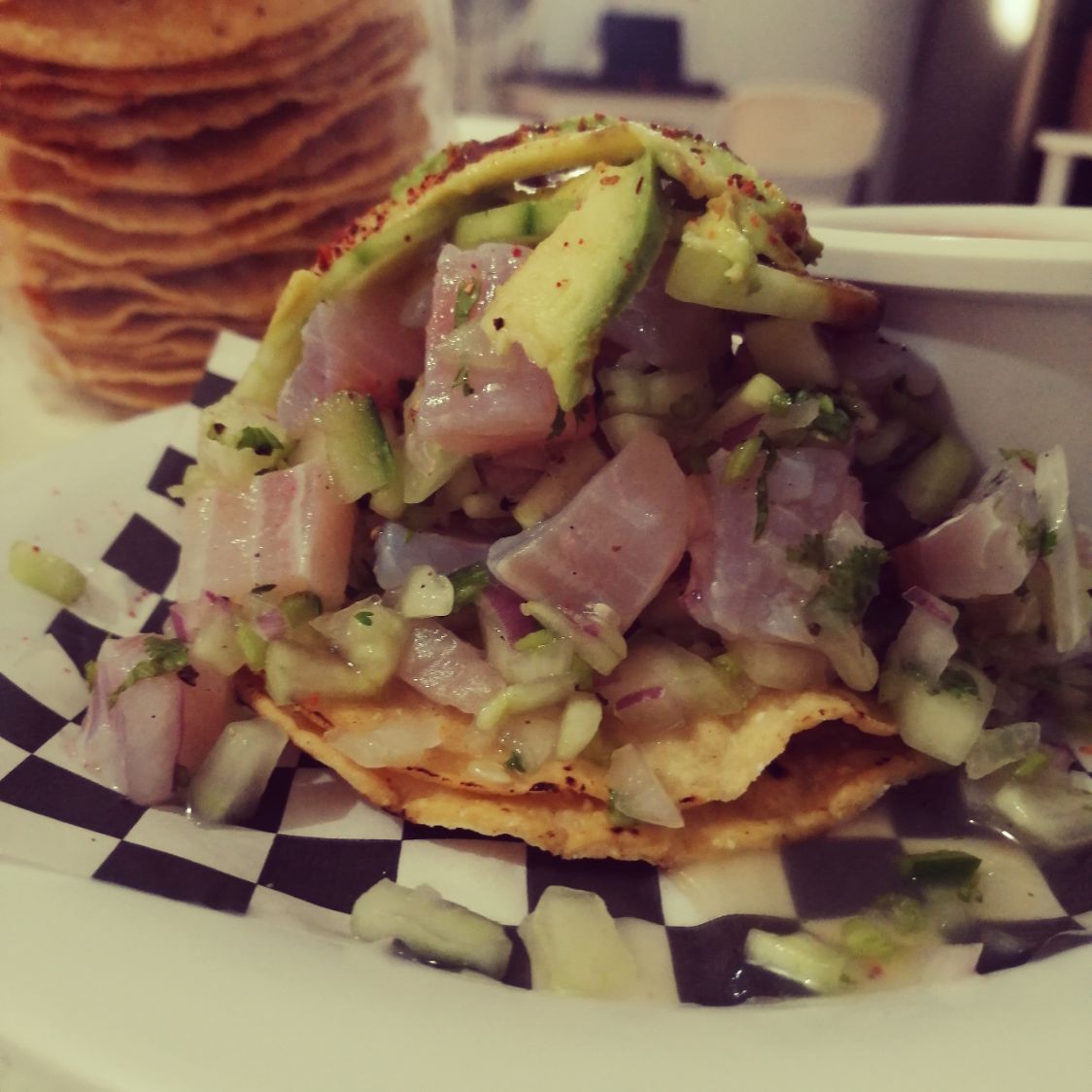 1/2 orden de Rico ceviche con verdura fresca, aguacate, tostadas y salsa de la casa.