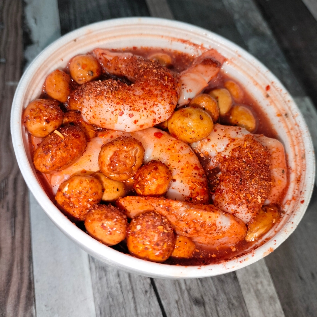 Camarón ahogado, camarón cocido, callo de lobina y pulpo, preparado con la deliciosa y única salsa de la casa.