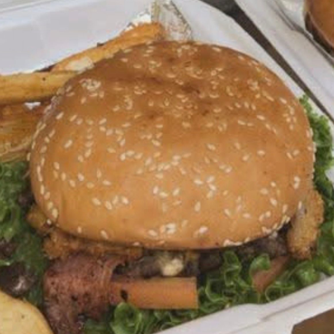 Carne de res, costra de queso, tocino, queso amarillo acompañado de papas.