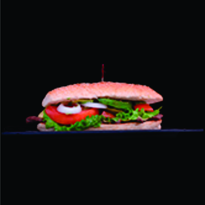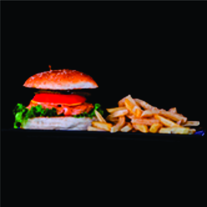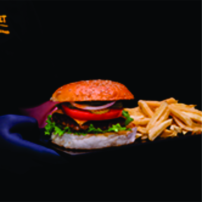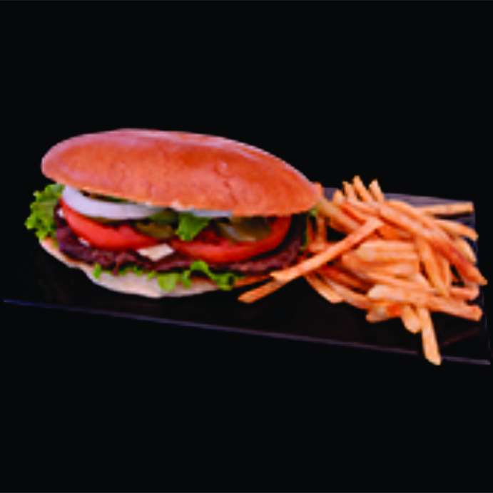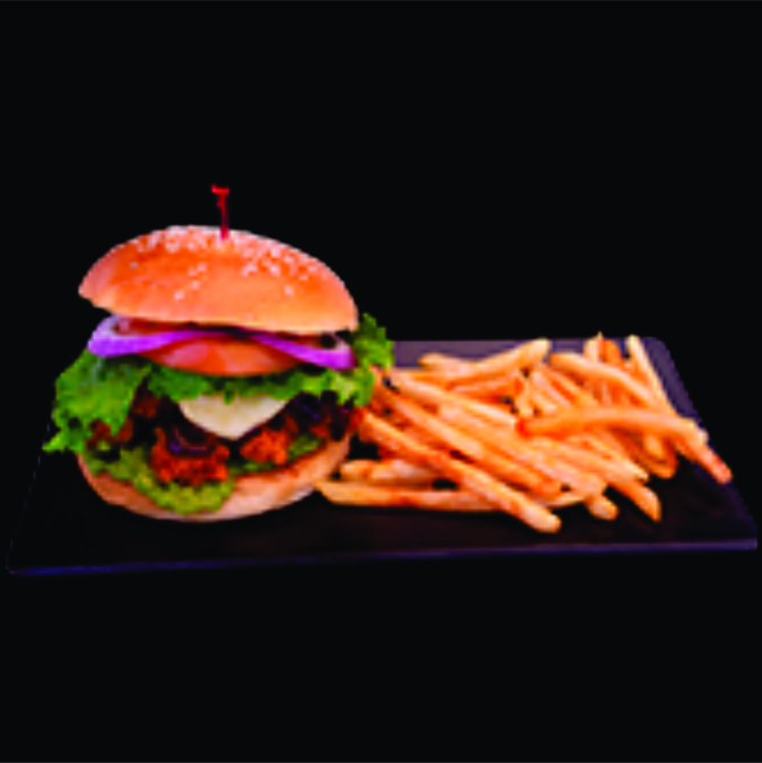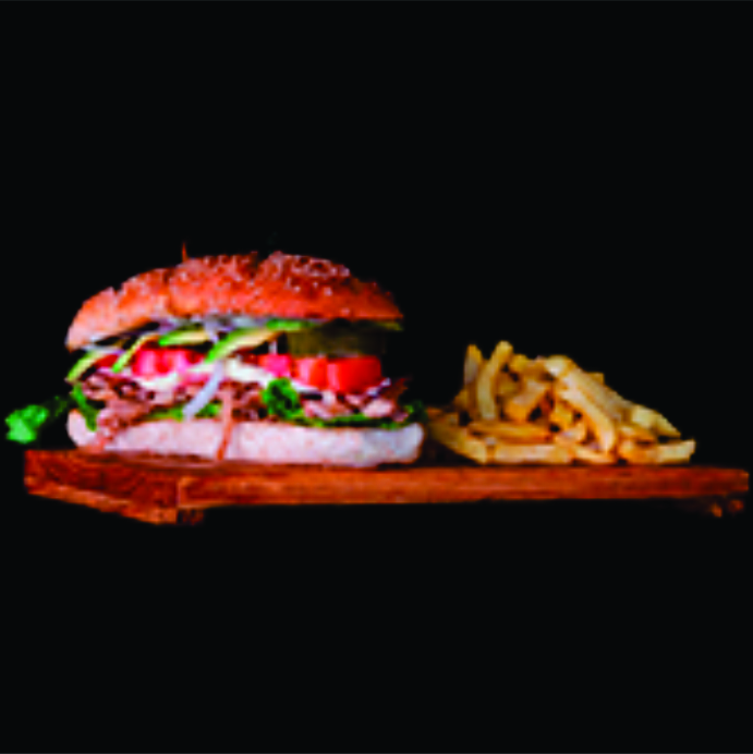 Pan brioche, verduras cebolla guisada,tocino carne de res y papas a la francesa