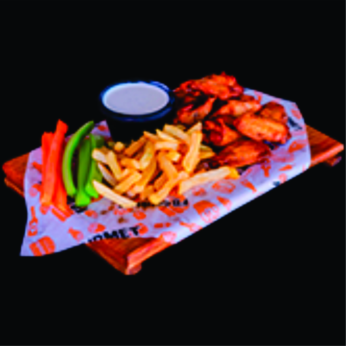 Alitas bañadas con salsa de tu eleccion (bbq,bufalo,chiltepin,habanero) acompañada de papas a la francesa,ranch,zanahoria y apio