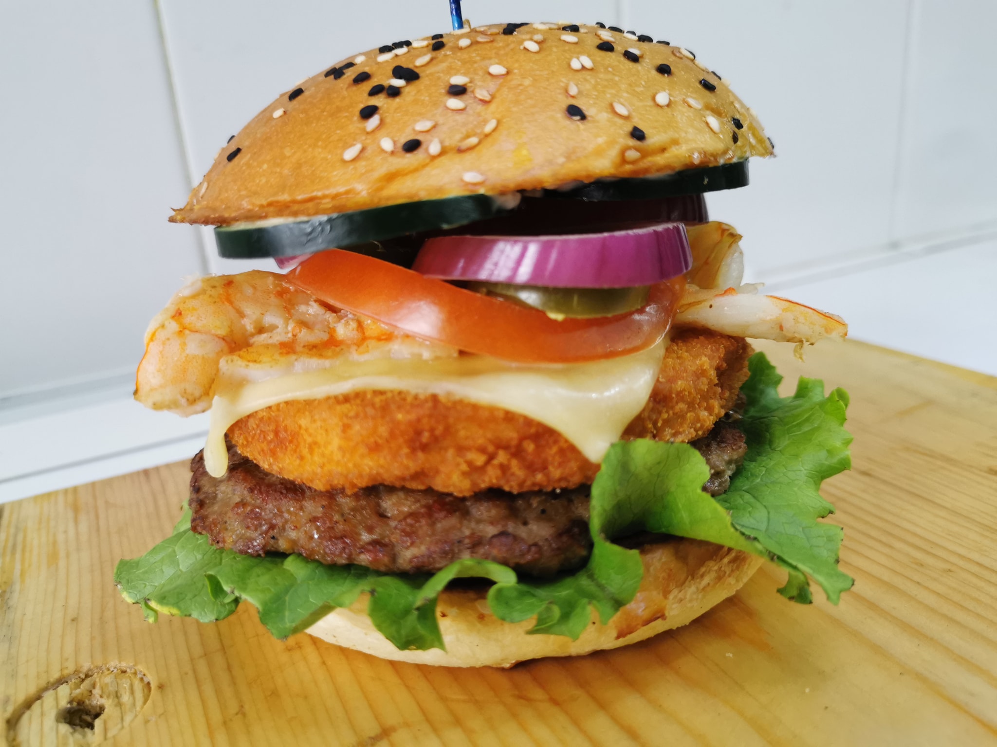 De camarón con papas, lechuga, tomate, cebolla, mostaza, pepinillos, chile, mayonesa y queso