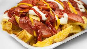 Carne en Trozos con queso gouda con papas, lechuga, tomate, cebolla, mostaza, pepinillos