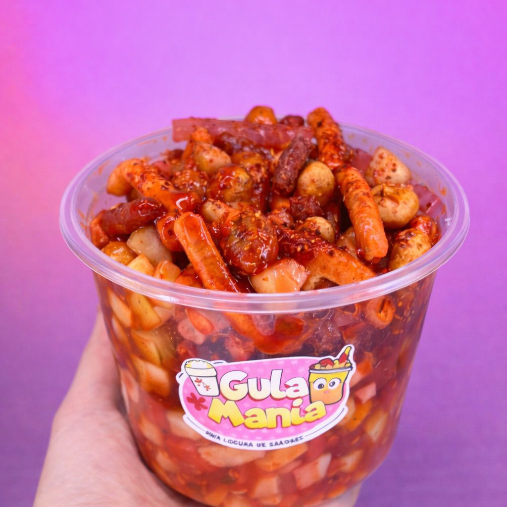 ½ L de pulpa de mango congelada y picada, coronada con skwinkles, gomitas, bolas de tamarindo y serpentinas.