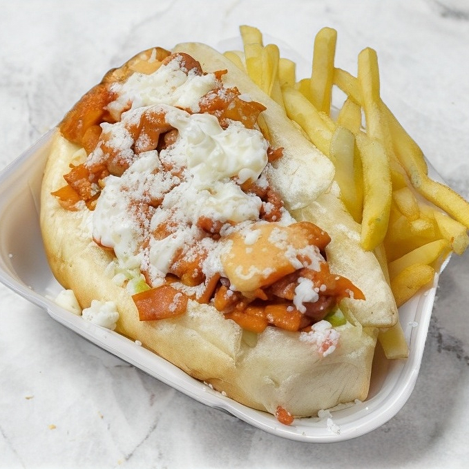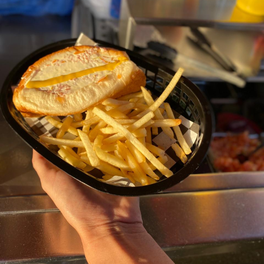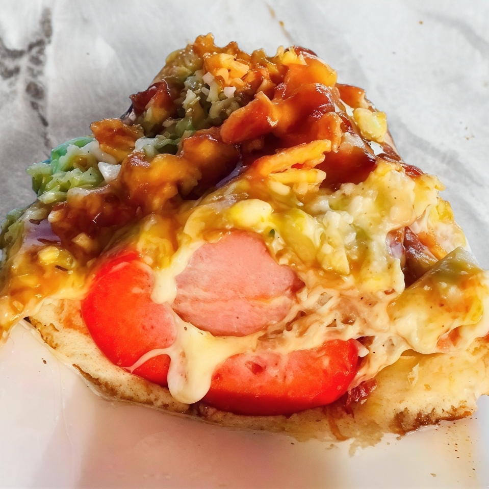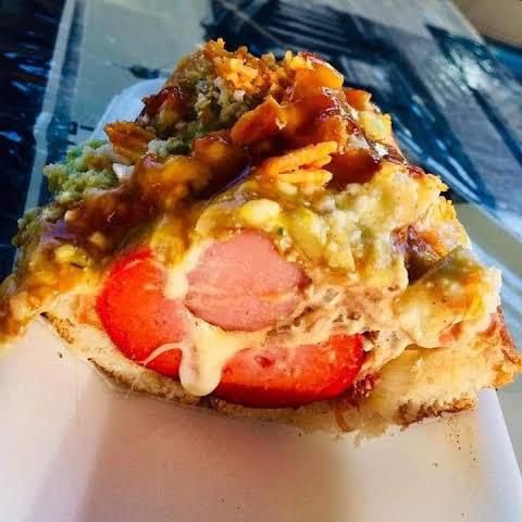 Queso extra en el pan,salchicha,tocino, Cebolla asada,cebolla cruda,tómate,mayonesa,aguacate,catsup,queso,mostaza