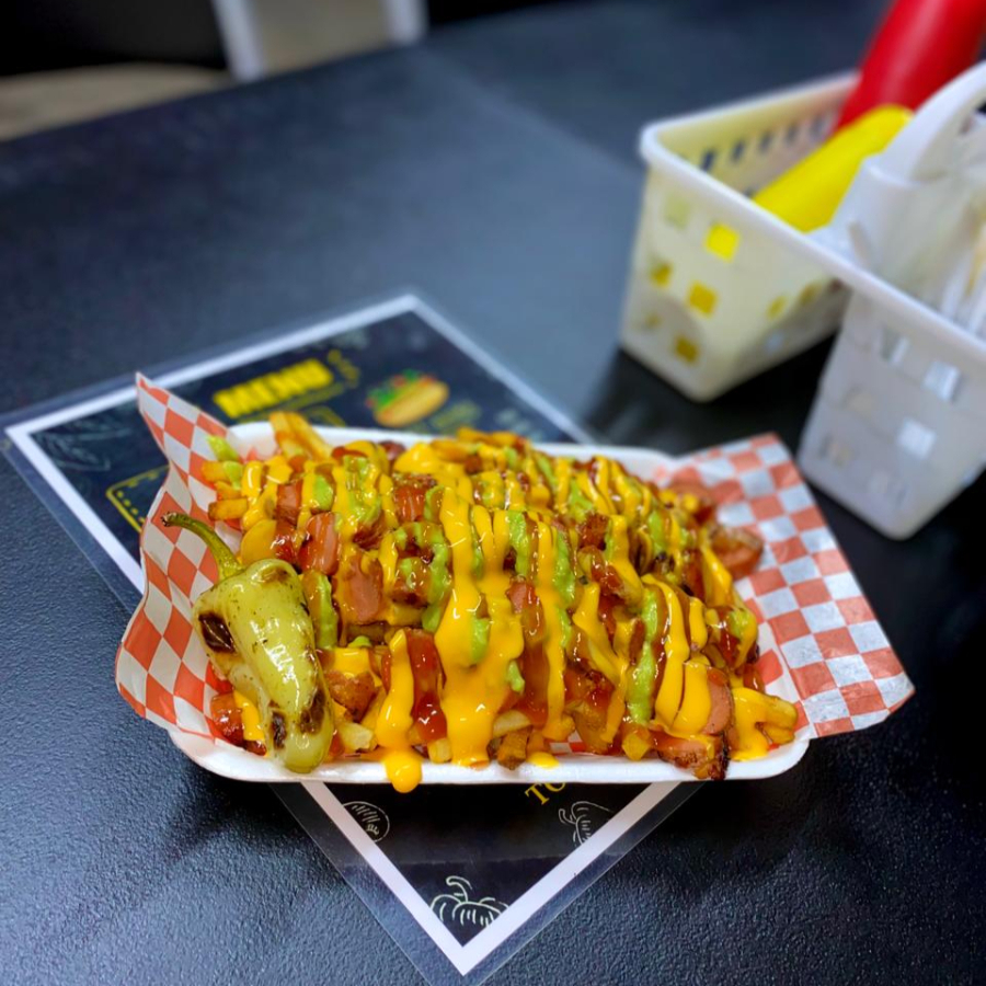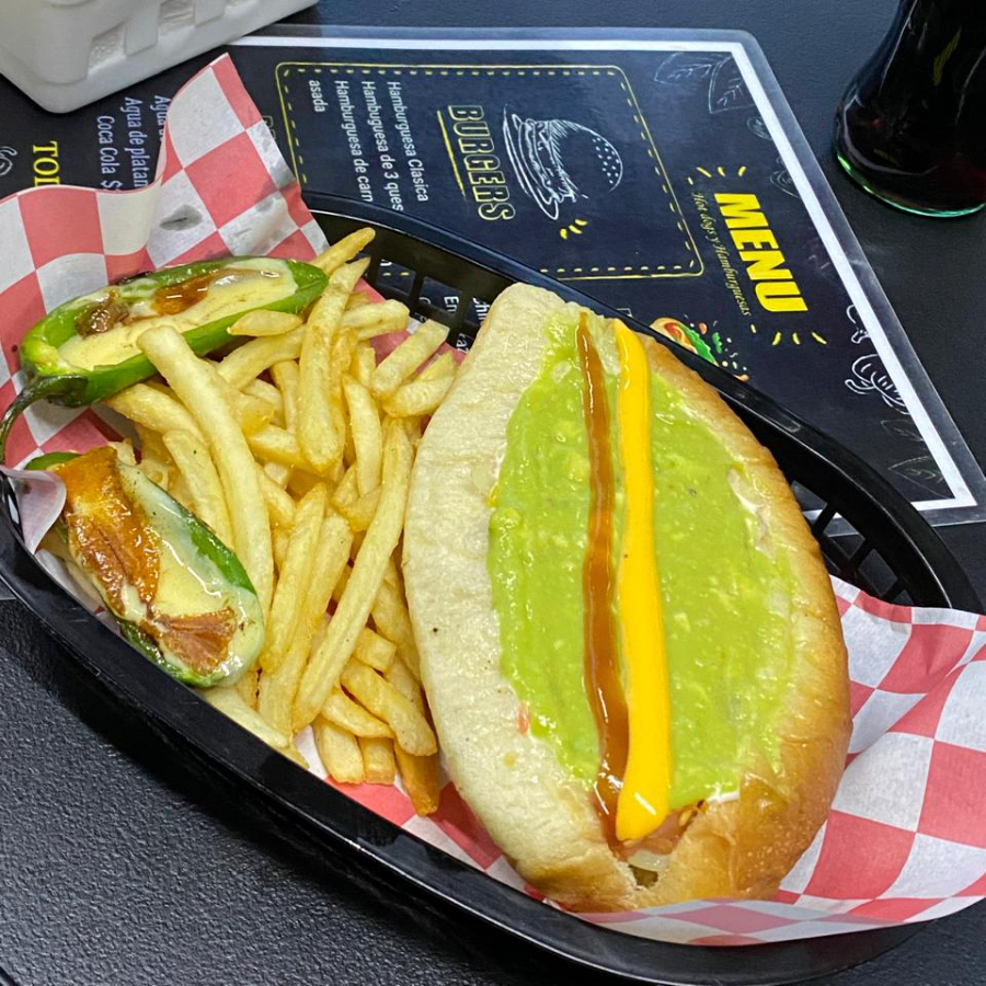 Dos salchichas picadas,papás,aguacate,catsup y queso