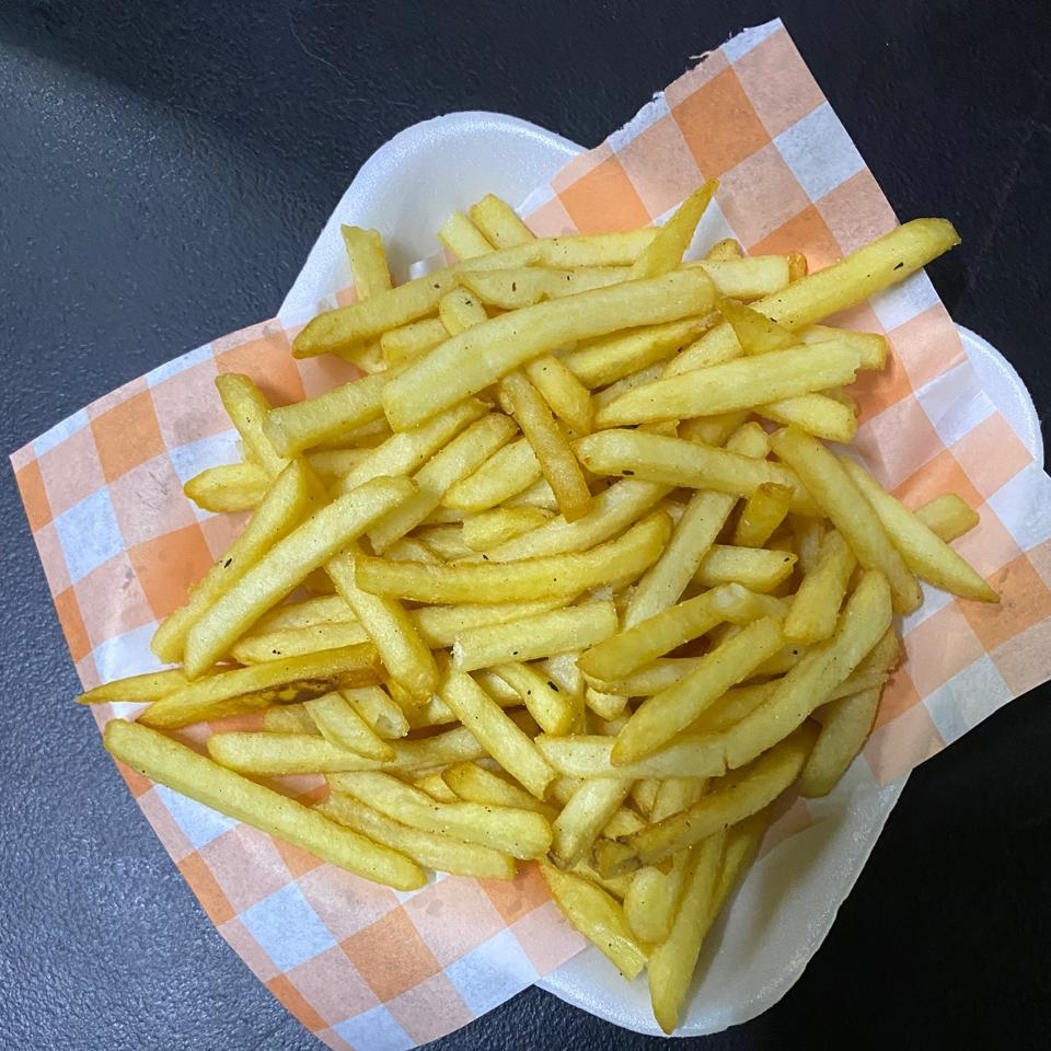 Hamburguesa clásica con carne de res acompañada con una porción de papas fritas