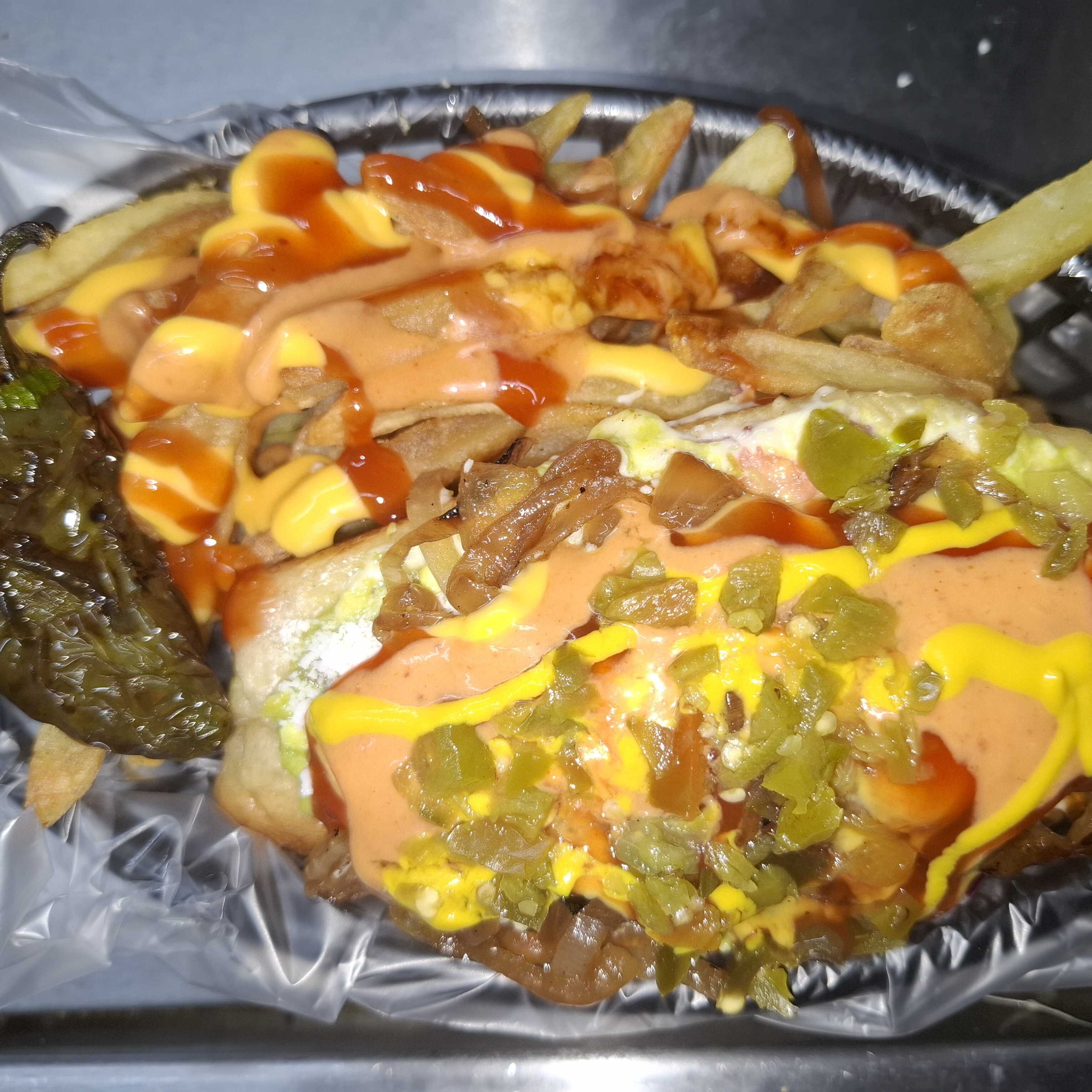 Papas, dos salchichas, mayonesa, queso rayado, aguacate, cebolla guisada y aderezos