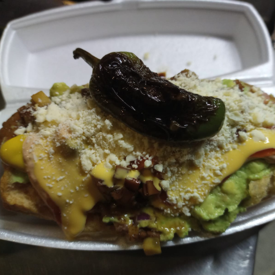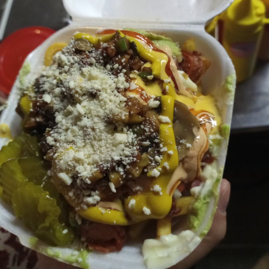 SALCHIPAPAS - VERDURA (AGUACATE, TOMATE, CEBOLLA MORADA, CEBOLLA GUISADA, ADEREZOS, QUESO RAYADO))